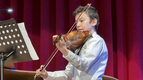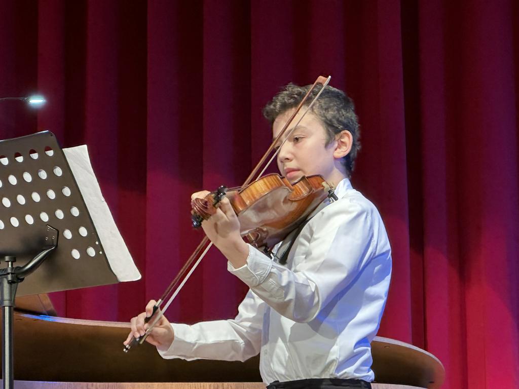 In der ersten Hälfte des Abends eröffnete Aurelia Kaiser aus der Klasse 5b das Programm und verzauberte mit ihrer Klavierkunst den ganzen Saal. Anschließend spielte Elijah Sampson aus der 5d zwei Stücke, die ebenfalls für große Begeisterung sorgten. Als Dritter betrat Kian Morajad aus der 6c die Bühne – mit seiner Violine, begleitet von Frau Rahrbach-Sander am Klavier. Das Publikum lauschte gebannt dem harmonischen Zusammenspiel.