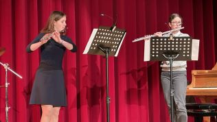 Im Anschluss stand Flötenmusik im Mittelpunkt. Judith Pfeiffer aus der 9a und ihre Lehrerin trugen zwei Stücke von Mozart vor, die das Publikum in Staunen versetzten. Dann überzeugte Valerio Pannozzo aus der 10a mit einem gefühlvollen und fehlerfreien Vortrag eines Stücks von Ludovico Einaudi.