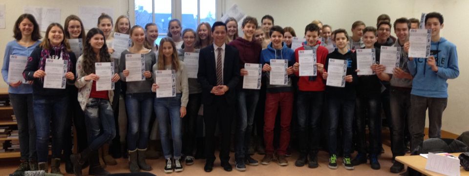 Wirtschaftskreislauf, Güterarten und Preisbildung - mit diesen Themen beschäftigte sich die Klasse 9e in den letzten Wochen im Unterricht. Die Schülerinnen und Schüler nahmen am Projekt "Fit für die Wirtschaft" teil, das vom Institut der deutschen Wirtschaft in Köln unterstützt wird. Als Lehrer stand ein Profi vor den Schülerinnen und Schülern: Quang Phong Dinh, Mitarbeiter der Targobank in Krefeld, übernahm die Aufgabe des Wirtschaftstrainers für die Klasse 9e. In vier Doppelstunden thematisierte er die Module "Was ist Wirtschaft?" und "Mein Traumberuf". Im Rahmen des Moduls "Mein Traumberuf" führten die Schülerinnen und Schüler eine Potenzialanalyse mit Selbst- und Fremdeinschätzung durch, um in ihrer Berufswahl unterstützt zu werden. Bewerbungsschreiben und Bewerbungsgespräche mit dem Schwerpunkt "Wie der erste Eindruck entsteht" wurden im Hinblick auf das im kommenden Schuljahr anstehende Betriebspraktikum mit besonderer Aufmerksamkeit verfolgt. Die Schülerinnen und Schüler der Klasse 9e erhielten zum erfolgreichen Projektabschluss ein Teilnahmezertifikat.