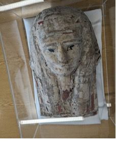 Anschaulich: Mumienmaske, unten rechts ist Schrift auf dem als Kartonage wiederverwendeten Papyrus zu sehen.