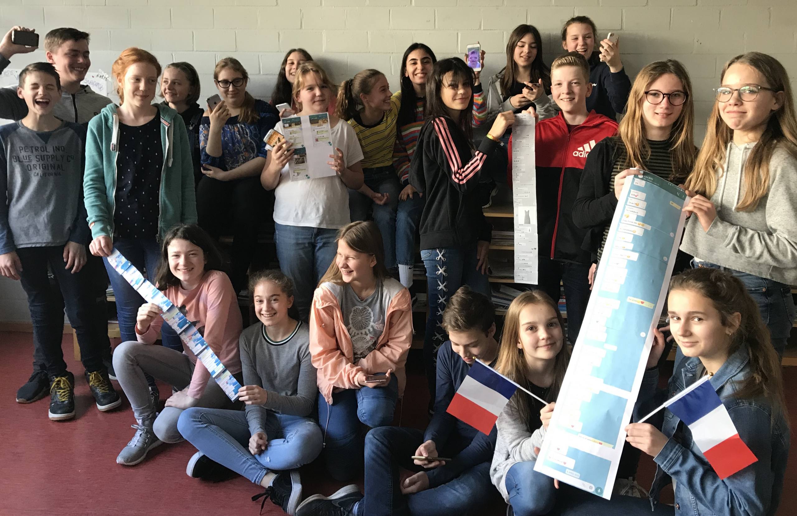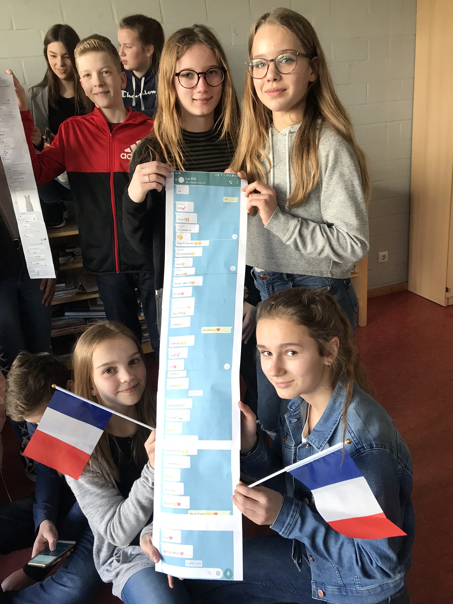 Smartphones anstatt Bücher? Gerne! In unserem Französischunterricht haben wir uns mit der Jugendsprache befasst. Dass wir in Gruppen etwas gemeinsam erarbeiten, ist uns auch schon aus anderen Stunden bekannt. Aber mit Hilfe von WhatsApp-Abkürzungen im Unterricht mit unseren Freunden chatten, ist für uns alle neu. Anschließend präsentierten wir unsere „kodierten“ Konversationen und werteten die Ergebnisse anhand vorher zusammen erarbeiteter Kriterien im Plenum aus.  Diese Abwechslung hat sehr viel Spaß gemacht! A2m