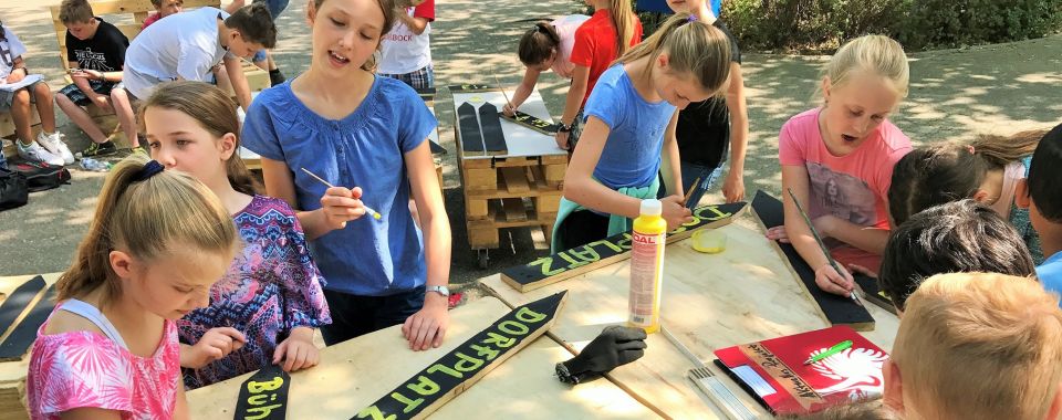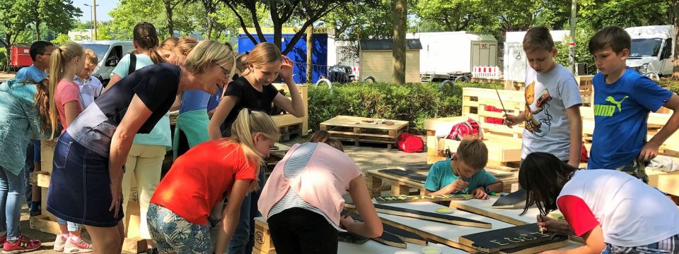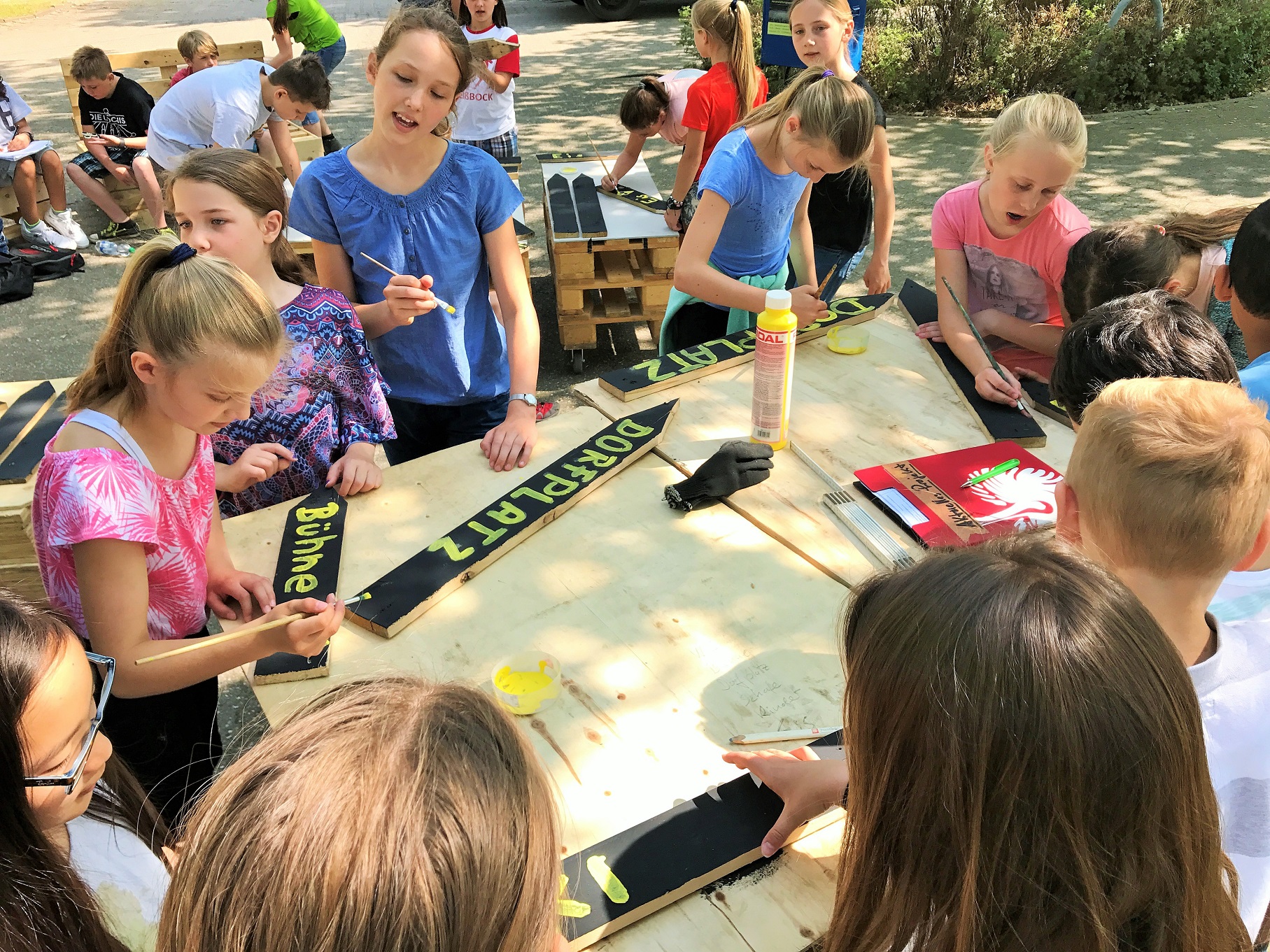 Am Donnerstag vor Pfingsten, dem 1. Juni 2017, machte sich die Klasse 5a in Begleitung der Klassenlehrerin Cordelia Rahrbach-Sander und der Kunstlehrerin Christina Evers auf zur Festivalhalle Moers, um dort unter Anleitung von Rüdiger Eichholtz Schilder für das 46. Moers Festival zu gestaltet. Bei bestem Wetter mit Sonnenschein malten die Schülerinnen und Schüler in den Festivalfarben Schwarz und Gelb Schilder, die die Besucher des Musikevents hoffentlich sicher über das Festivaldorf geleitet haben.