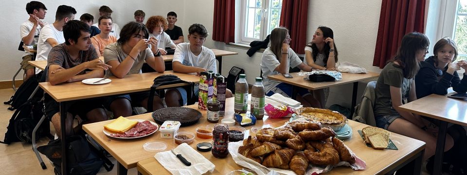 Un petit-déjeuner français - der Französischkurs 9c/e genießt französische Spezialitäten nach der Arbeit an seinem Frankophonie-Projekt
