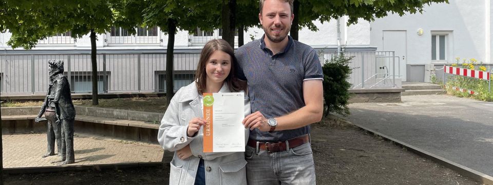 Im Rahmen des Geschichtswettbewerb des Bundespräsidenten ist Lena Jaeger (Einführungsphase) mit einem Förderpreis ausgezeichnet worden. In ihrer Arbeit setzte sich Lena Jaegermit dem Thema „Verrat an dem Arbeitersport? – die gesellschaftlichen Zwänge im Nationalsozialismus“ auseinander. Dafür recherchierte sie unter den erschwerten Bedingungen während der Corona-Pandemie unter anderem im Stadtarchiv und der NS-Dokumentationsstelle Moers. Dort wurde sie durch die Hilfe von Dr. Bernhard Schmidt fündig und stieß auf ein aufgezeichnetes Interview mit Gertrud Schmitz, das als zentrale Quelle für ihren Wettbewerbsbeitrag fungierte.
