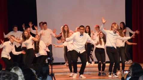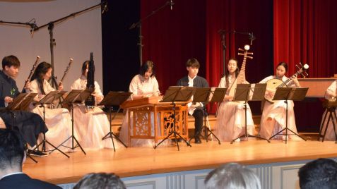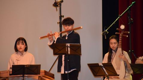 Sorgt Yihu Schlossarek als Muttersprachlerin für die unglaubliche Lernleistung der Schülerinnen und Schüler in nur drei Jahren, da Chinesisch erst ab der Oberstufe als neueinsetzende Fremdsprache (auch als Abiturfach) gewählt werden kann, garantiert die Zusammenarbeit mit dem Konfuzius-Institut dafür, dass die Lernenden mit dem Land China und seiner Kultur vertraut gemacht werden. Durch wunderbare Aktionen des Konfuzius-Instituts kommt China an den Niederrhein. So gab das Studentische Ensemble Chinesischer Musik vom Zentrum für Kunstausbildung der Universität Wuhan ein Jubiläumskonzert auf klassischen chinesischen Instrumenten in der Aula des Gymnasium Adolfinum. Ergänzt wurde diese Darbietung durch zwei Chinesischlerngruppen der Schule. Auch hieran nahmen Minel und Gregor begeistert teil. Frau Chen vom Konfuzius-Institut hatte zu modernen chinesischen Popsongs eine raffinierte Gruppenchoreografie einstudiert.