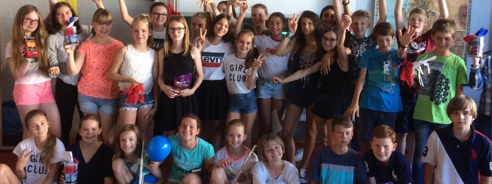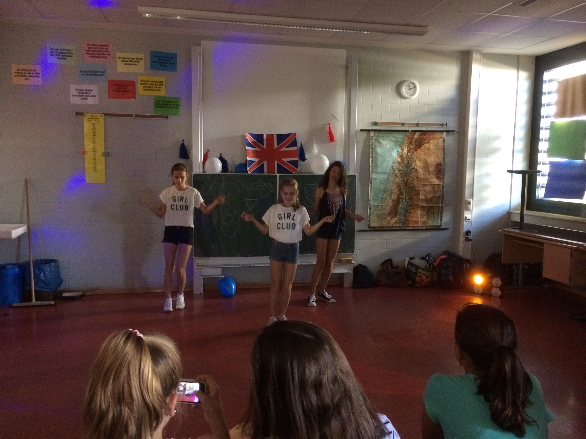 "Wir, die Klasse 6b, haben kurz vor den Ferien eine britische Klassenparty gefeiert. Jeder aus der Klasse hat typisch britische Dekoration, Essen, Süßigkeiten usw. mitgebracht. Einige aus der Klasse haben Kunststücke oder einen Tanz vorbereitet, wozu dann auch eine kleine Show vorbereitet wurde. Auf der "Bühne" standen sowohl Zauberer als auch Tänzer und viele mehr. Einige Lehrer sind auch zu uns gekommen, um mitzufeiern und die Artisten zu sehen. Die Atmosphäre war sehr schön, alle waren zufrieden und glücklich.