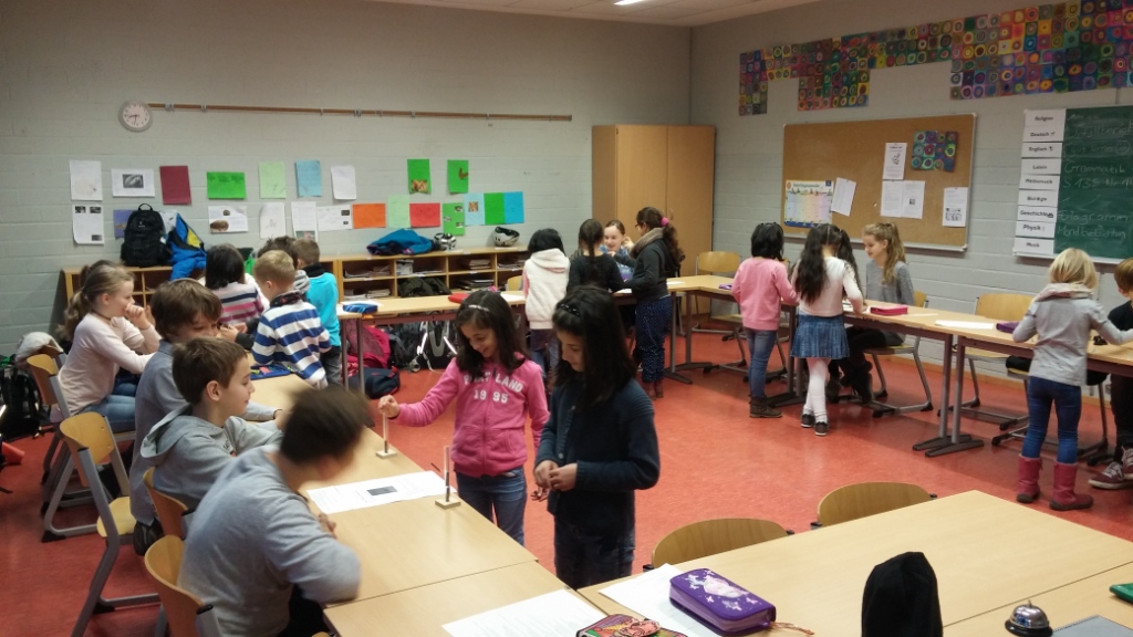 Beim Treffen mit den Grundschülerinnen und Grundschülern ging es dann darum, das erlangte Wissen weiterzugeben. Dazu gab es an jeder Experimentierstation Experten, die die kleinen Forscher der Gebrüder-Grimm-Grundschule anleiteten und ihnen bei der Durchführung der Experimente behilflich waren. Mit dabei war auch Grundschullehrerin Inga Fischer, die von dem gemeinsamen Lernen der Großen und Kleinen sehr angetan war: „Die Kleinen haben viel Spaß daran, hier am Gymnasium mit den Großen spannende Experimente durchzuführen. Sie erwerben nun ihrerseits das nötige Wissen, um dann später den Kindergartenkindern, die unsere Grundschule besuchen werden, bei der Durchführung der Experimente behilflich zu sein.“