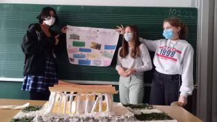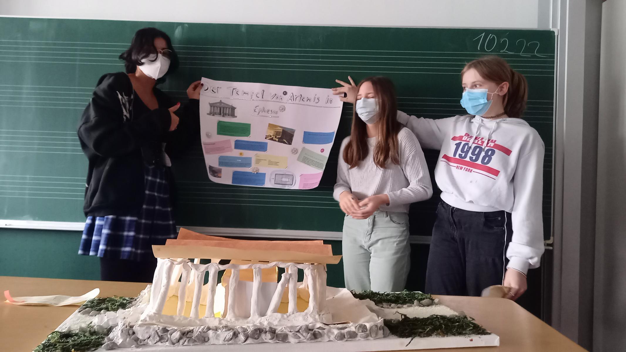 Im Fach Geschichte behandeltem wir die sieben Weltwunder der Antike. Dazu machten wir eine Projektarbeit in mehreren Gruppen. Wir bearbeiteten fünf der sieben Weltwunder, wobei der Koloss von Rhodos und die Zeus-Statue in Olympia von keiner Gruppe ausgewählt wurde. Es gab drei Gruppen, die sich mit den Hängenden Gärten von Babylon befasst haben. Je zwei Gruppen bearbeiteten den Artemis-Tempel in Ephesos und das Grab des Mausolos. Um den Leuchtturm von Pharos und die Pyramiden von Gizeh kümmerte sich jeweils eine Gruppe.