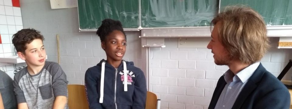 Das Thema "Migration und Integration", welches das Fach Politik in Klasse 7 vorsieht, wird von den Schülerinnen und Schülern seit Jahren gut angenommen. Die europäische Flüchtlingssituation aus dem Jahre 2014/15 hat das Bewusstsein über die Bedeutung eines friedlichen Miteinanders von Einheimischen und Asylsuchenden bei den jungen Menschen noch einmal verschärft. Umso erfreulicher, dass Jan Pütter, Abiturient aus diesem Jahr und bis dahin auch Schülersprecher am Adolfinum, der 7b, der 7d und der 7e, die von Daniel Heisig-Pitzen unterrichtet werden, Rede Antwort stehen konnte. Er ist seit mehreren Jahren ehrenamtlicher Flüchtlingshelfer in Moers und in diesem Jahr Mitglied des Flüchtlingrates der Stadt Moers. Die Berichte seiner direkten Begegnungen und die Schilderungen der sozialen und persönlichen Schwierigkeiten, die Flüchtlinge in Moers zu bewältigen haben, hinterließen einen tiefen Eindruck bei den Schülerinnen und Schülern, wie der nachfolgende Bericht von Nina Töpfer aus der 7b aufzeigt - auch die Bilder aus dem Unterrichtsgespräch stammen aus dieser Klasse: