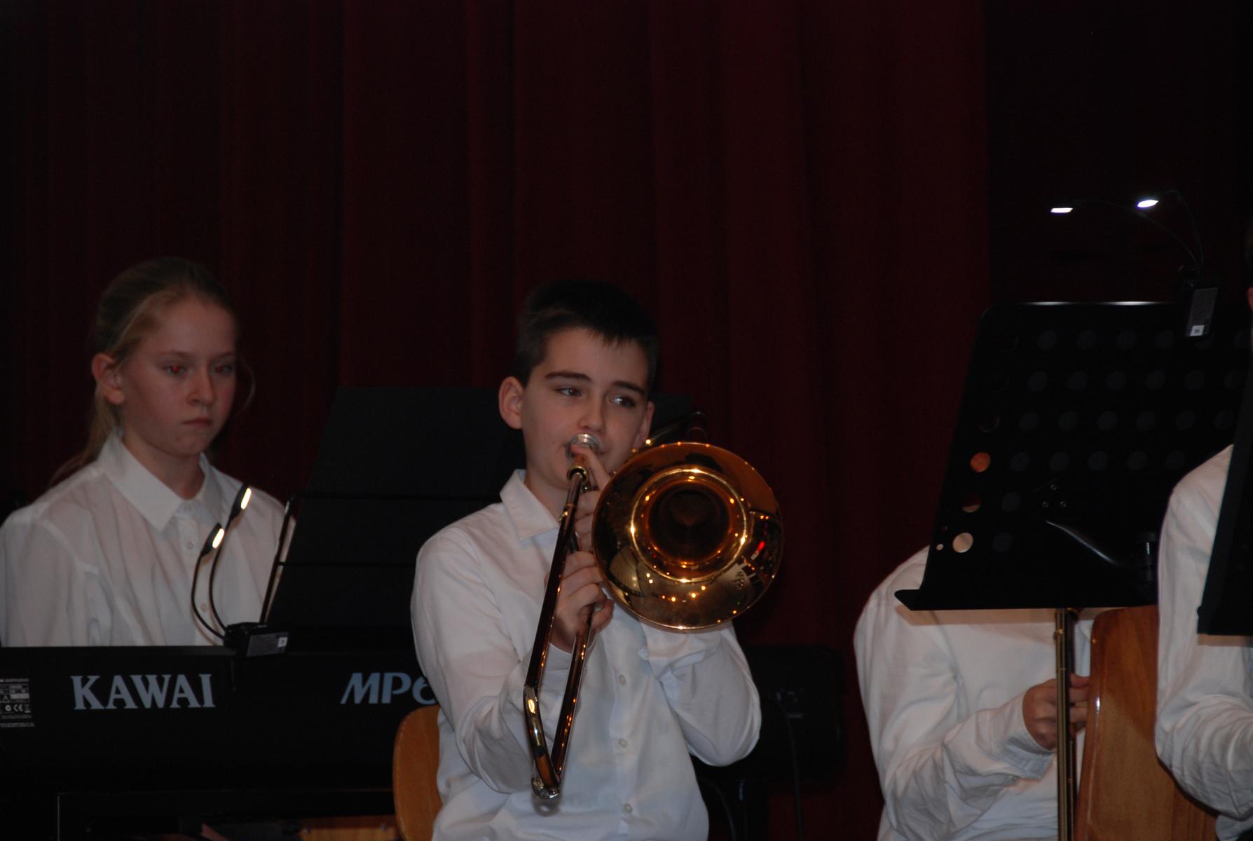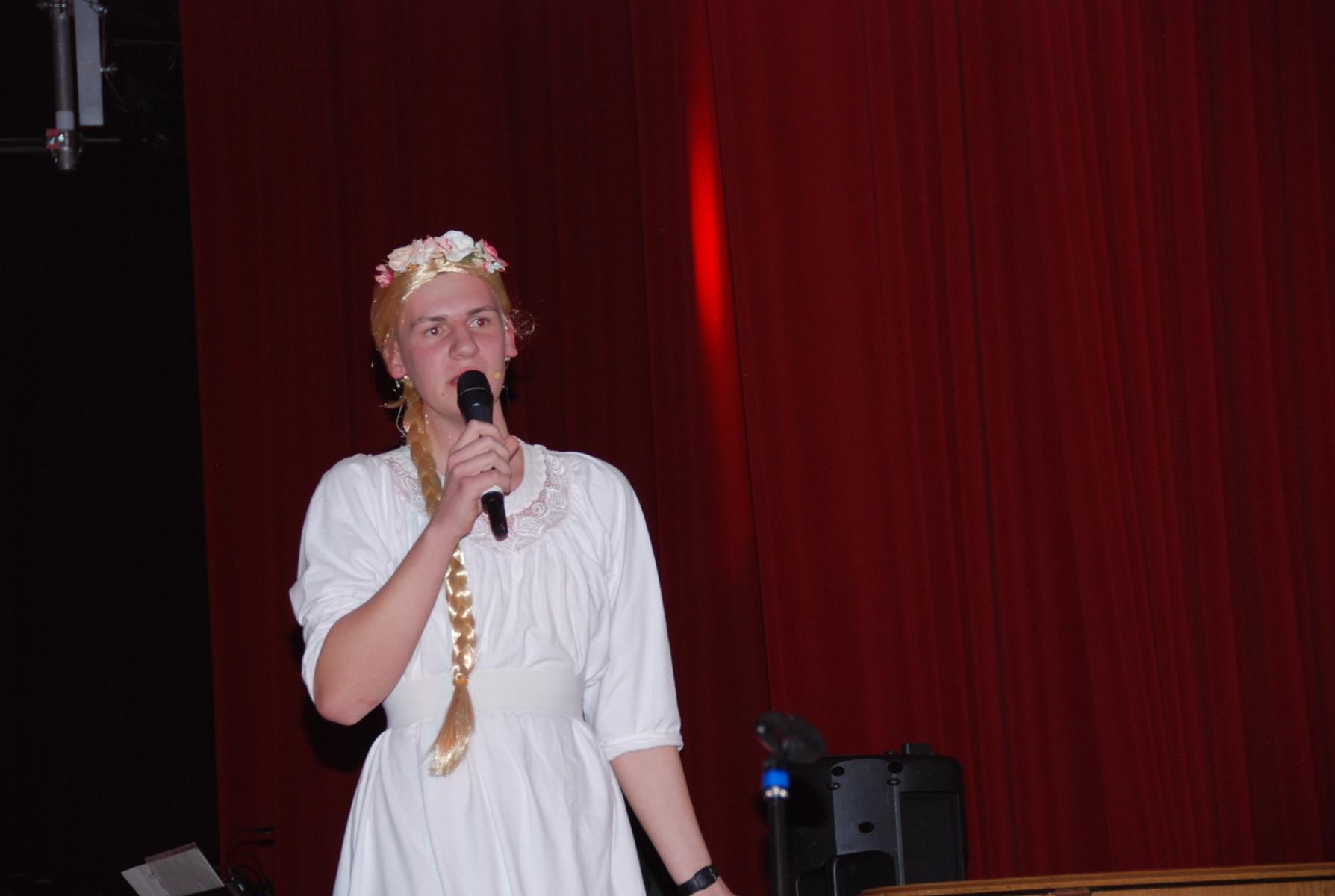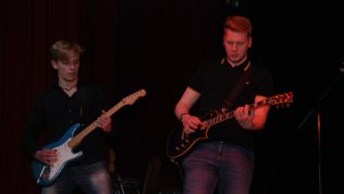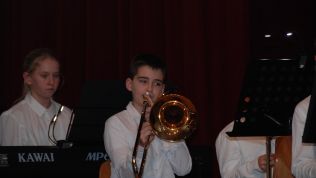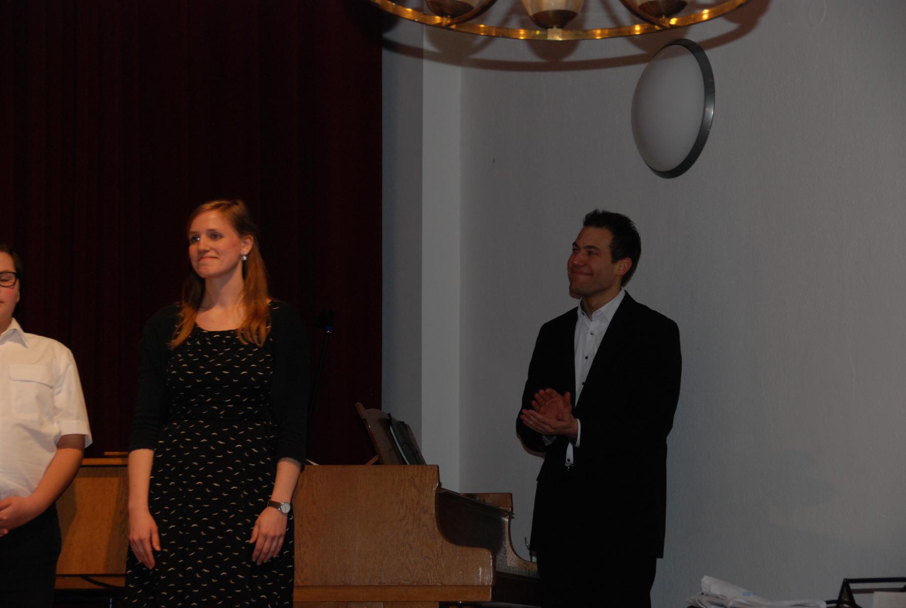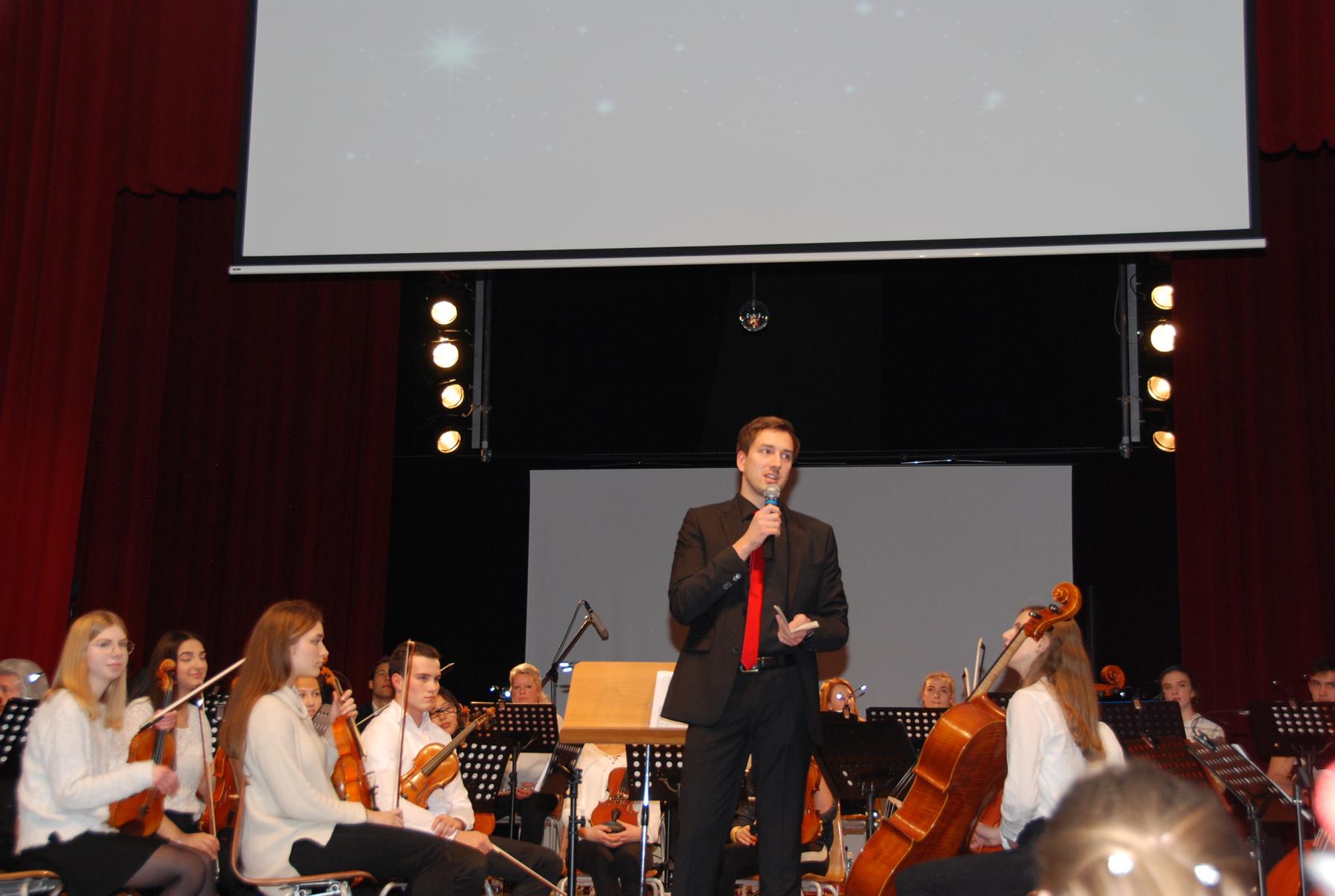 Im Rahmen der anschließenden Danksagungen wurde auch Musiklehrer Philipp Niersmans als neues Mitglied der Musikfachschaft stellvertretend von Simon Stockamp offiziell willkommen geheißen, der sowohl in der JungenSinfonieMoers und im Sinfonisches Blasorchester als Trompeter und Pianist mitspielte, als auch den Unter- und Mittelstufenchor am Klavier begleitete.