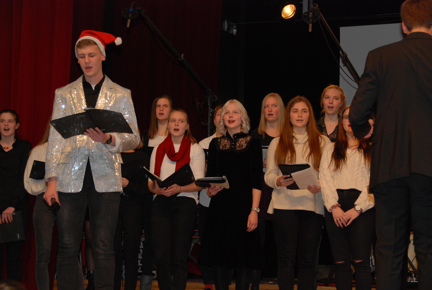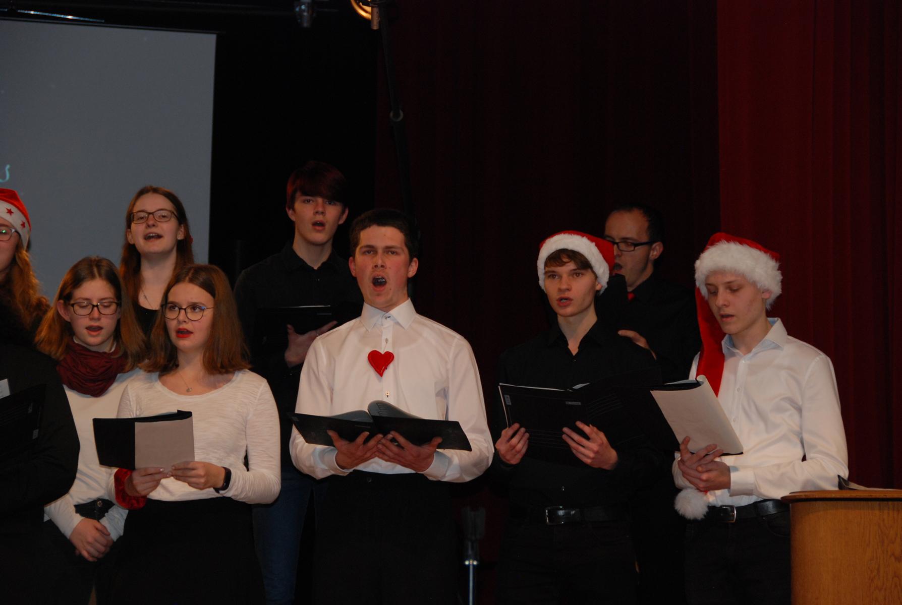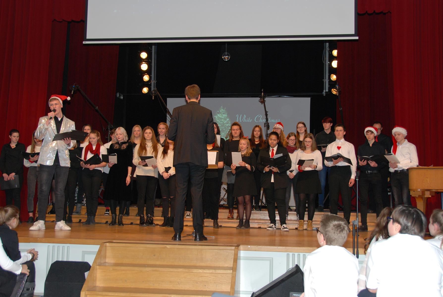 Meisterte weiße Weihnacht amerikanischer Art: Der Oberstufenchor unter der Leitung von Musiklehrer Simon Stockamp und Musikreferendarin Simone Ruppik.
