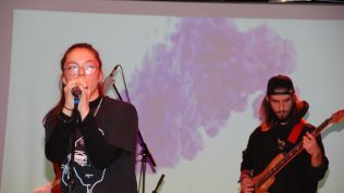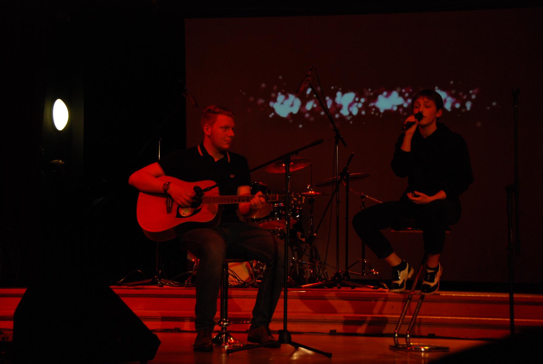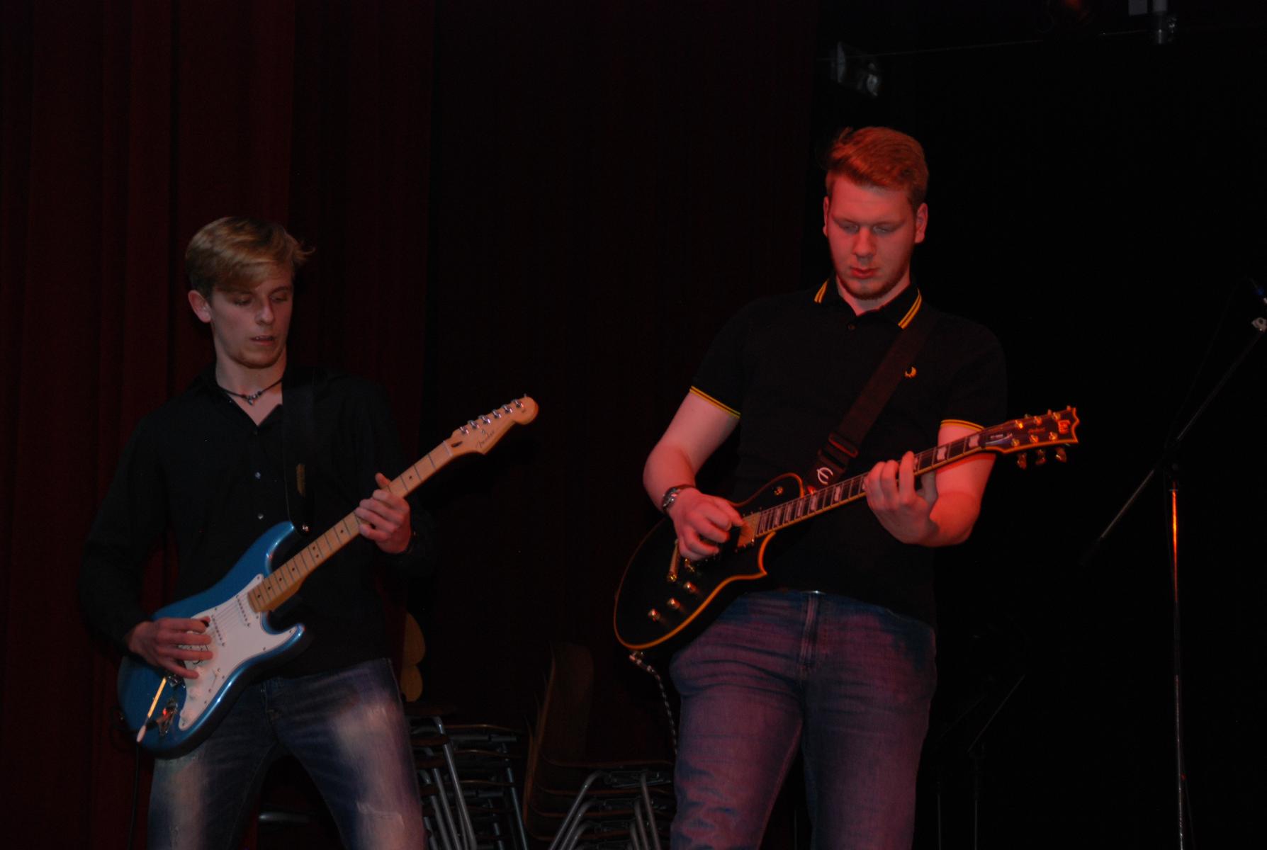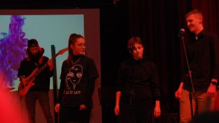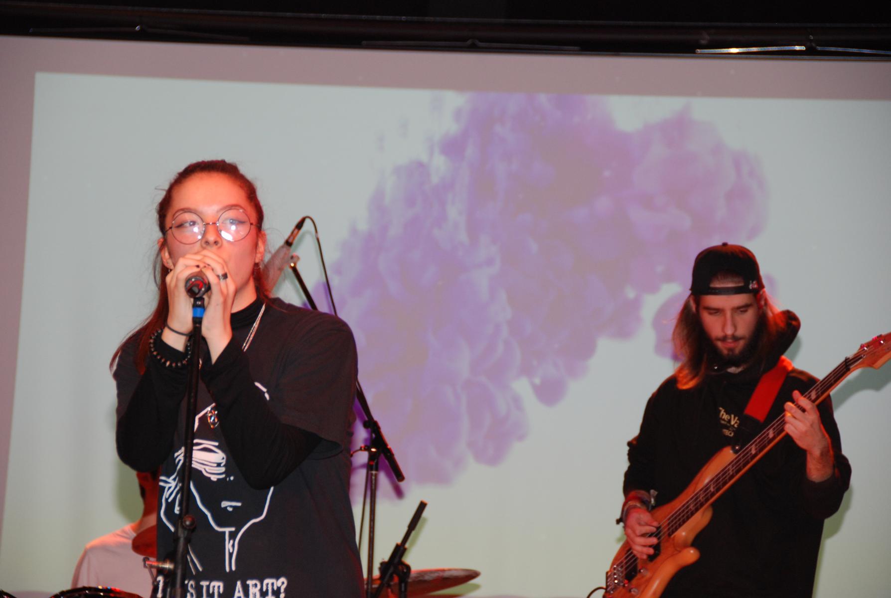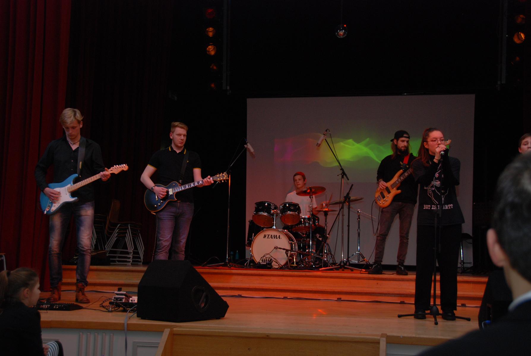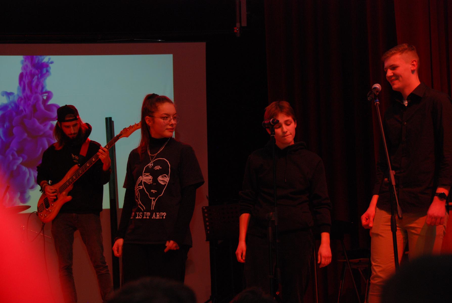 Weniger weihnachtlich aber dafür wie gewohnt durch große Stilvielfalt ausgezeichnet überzeugte anschließend Die Band unter der Leitung von Musiklehrer Jörg Meschendörfer – dieses Mal als Novum mit drei SängerInnen. Zunächst bei gedimmtem Licht auf zwei Barhockern sitzend sang Julia Weber begleitet von Michel Soete an der Westerngitarre Billie Eilishs „Wish you were gay“, bevor „Don’t cry“ als einer von Guns n‘ Roses Hardrock-Klassikern den Kontrast zur vorangegangenen ruhigen Akustiksession bildete. Ein Überraschungsmoment bot sich im Anschluss mit dem romantischen Duett „See the light“ aus dem Film Tangeld (Rapunzel – neu verföhnt), welches von Julia Weber und Mathis van Schoonhoven nicht nur gesungen, sondern auch in vertauschen Geschlechterrollen schauspielerisch vor projizierten Ausschnitten aus dem Film inszeniert wurde. Das Set der Band beendete der Klassiker „Hotel California“, bei dem im Gegensatz zu „Don’t cry“ nicht alle drei SängerInnen im Trio performten, sondern Sängerin Elisa Pickardt begleitet vom Backgroundgesang der anderen beiden als Frontfrau im Vordergrund stand. Neben den beeindruckenden E-Gitarrensoli von Tim Pesch – auch zusammen mit Michel Soete – stellten zum ersten Mal mit der Band auch Henning Rütten am E-Bass und Julius Fischer am Schlagzeug ihr Können unter Beweis.
