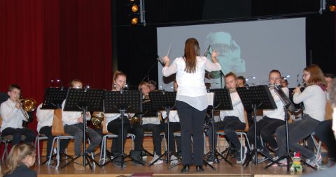 Spielten ein humorvolles, bewusst chaotisches Arrangement und Medley: Das Sinfonische Blasorchester unter der Leitung von Katharina Adams.