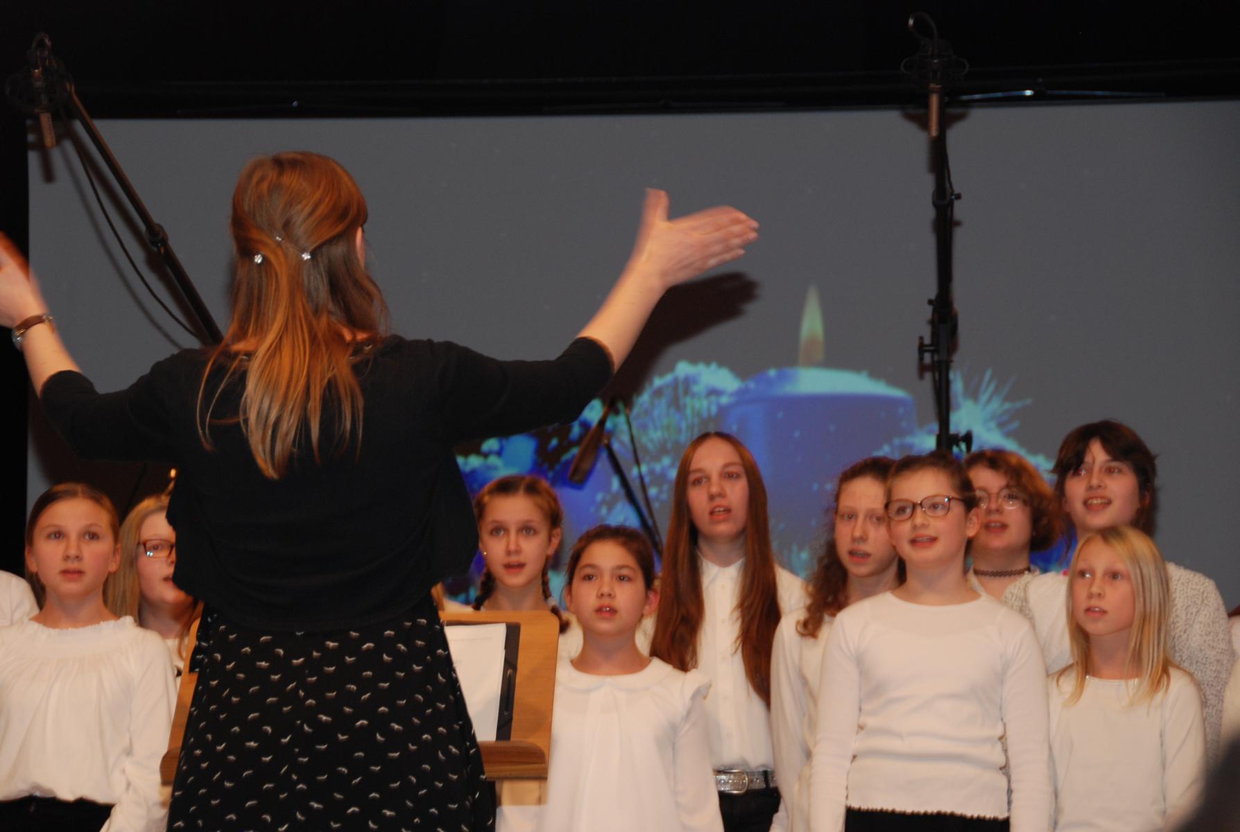 Zweiter vokaler Block: Der Unter- und Mittelstufenchor mit Musiklehrerin Cordelia Rahrbach-Sander und Musikreferendarin Simone Ruppik.