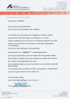 Dankesbrief der AIDS-Hilfe in Duisburg, der wir uns seit Jahren verbunden fühlen
