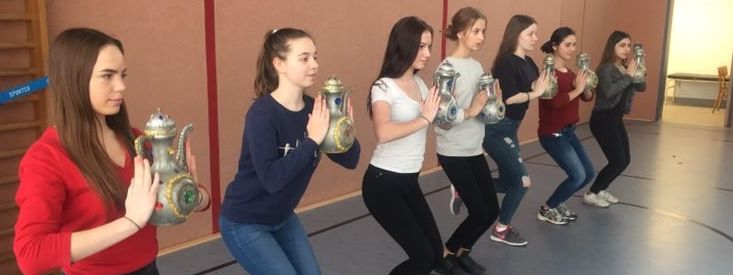 Mit Spaß bei der Sache: Adolfinerinnen konzentriert beim Karaffentanz