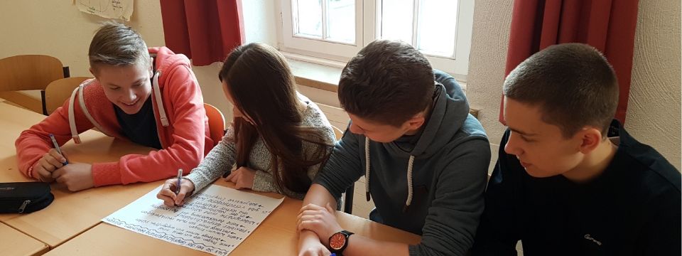 Felix Krahl, Paula Weyen, Lou Schulz und Mats Lammert bei der Vorbereitung ihrer Zeitzeugengespräche.