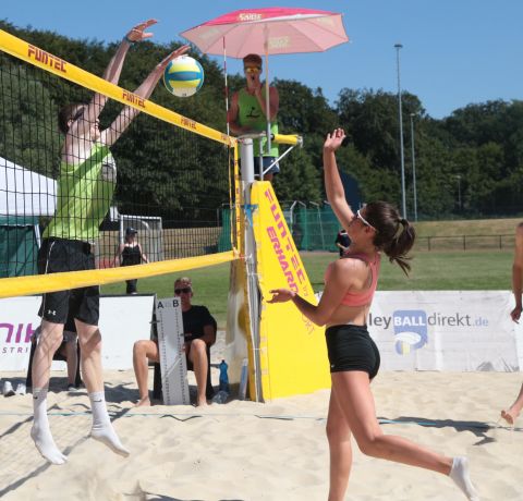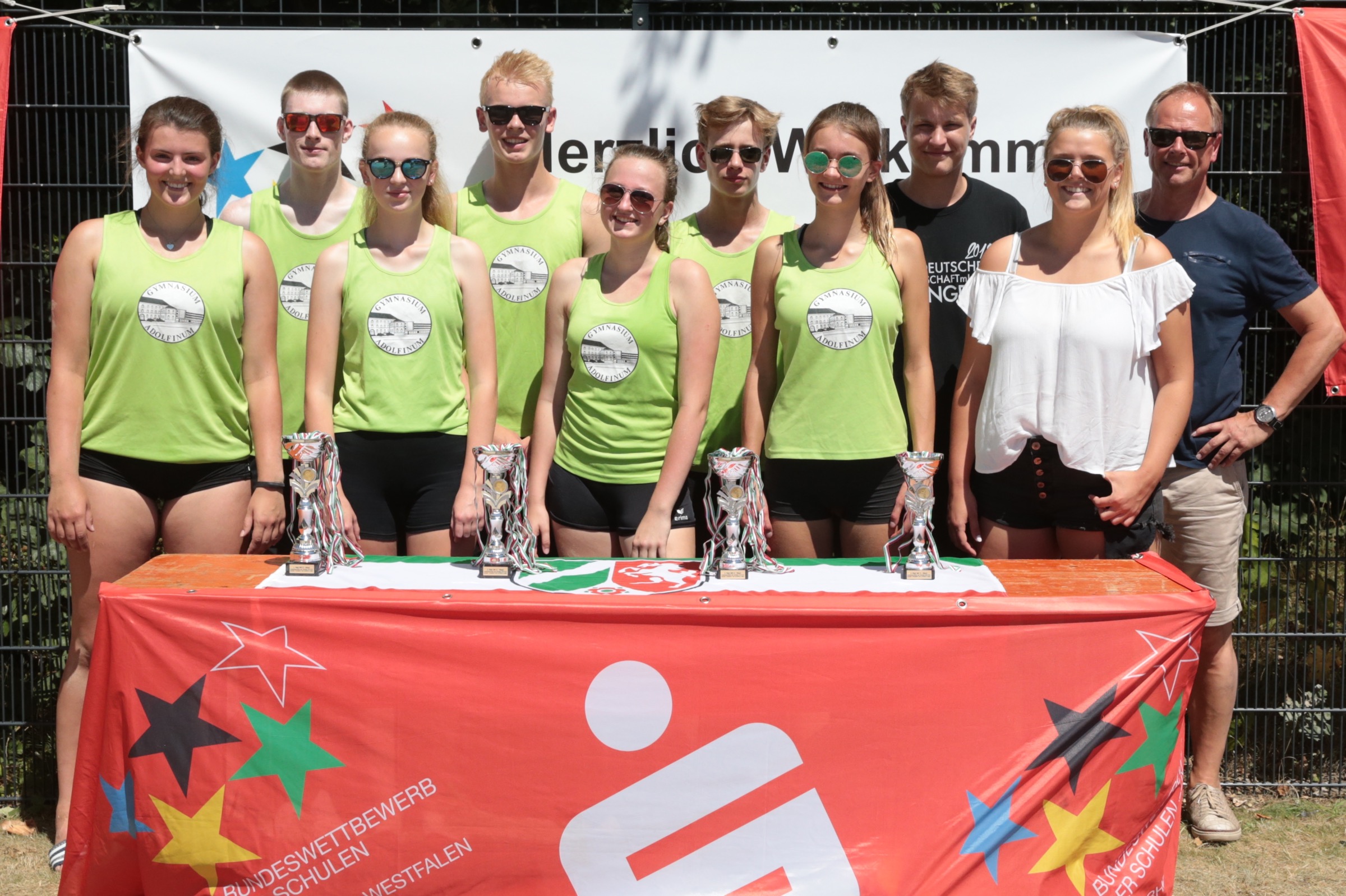 Heißer Sand, knallige Sonne und tropische Temperaturen – anstelle von klimatisierten Klassenräumen: so kann Schule auch sein. Zum Beispiel beim Turnier um die Landesmeisterschaft der Beachvolleyballer der Schulen in Marl, die zeitweise allerdings zu einer echten Qual (Sand so heiß, dass in Socken gespielt wurde) für das Adolfinum-Team unter der Leitung von Sportlehrer Martin Schattenberg wurde. In Marl warteten in der Grupenphase mit dem Städtischen Gymnasium Sundern und dem Wilhelm Hittorf Gymnasium Münster echte Hochkaräter auf die Adolfiner. Im Vorfeld jedoch mussten die Münsteraner ihre Teilnahme wegen einer Terminüberschneidung (Kurs- und Klassenfahrt) absagen. Somit stiegen die Chancen auf den Gruppensieg.