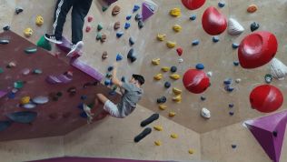 Um weiterhin nachhaltig zu bleiben, nutzte der Kurs gemeinsam mit Frau Sokolowski und Herrn Dierks zur Anfahrt den ÖPNV. In der Halle selbst erhielten alle Schülerinnen und Schüler zuerst eine kurze Anleitung, was beim Bouldern zu beachten ist und woran sich der Schwierigkeitsgrad einer Route erkennen lässt. Danach ging es nach einer kurzen Aufwärmphase in die Wand.