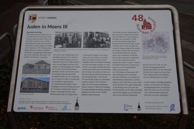 Am 10. Dezember fand die Einweihung einer neuen Geschichtsstation in der Moerser Fußgängerzone statt. Sie thematisiert die Deportation von über 100 jüdischen Bürgerinnen und Bürgern nach Riga und Theresienstadt in den Jahren 1941 und 1942. Aufgestellt wurde die Tafel an der ehemaligen Haltestelle „Steinschen“ (Ecke Neustraße/Krefelder Straße), wo die beiden Verschleppungsaktionen ihren Anfang nahmen.
