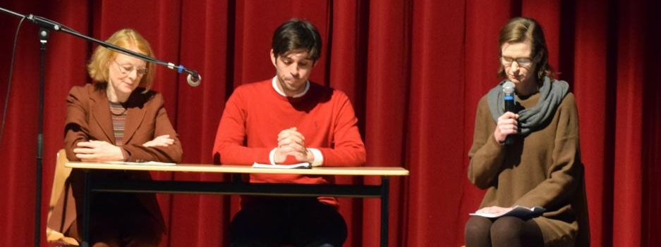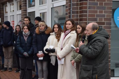 In einem Gedenkakt, der zuvor in der Aula unserer Schule stattfand, wurde der Opfer dieser schrecklichen Ereignisse gedacht. Neben der stellvertretenden Bürgermeisterin Claudia van Dyck erinnerten Vertreterinnen und Vertreter unterschiedlicher Moerser Vereine an die Deportationen. Sie  riefen dazu auf, die damaligen Gräueltaten niemals zu vergessen und Hass und Intoleranz entschieden entgegenzutreten. Auch unsere Teamerinnen und Teamer des Auschwitzprojekts gestalteten die Einweihungsveranstaltung der Geschichtsstation aktiv mit und brachten eigene Wortbeiträge ein. Abgerundet wurde die Veranstaltung mit einer Lesung von Zeitzeugenberichten durch Schauspieler des Schlosstheaters Moers.