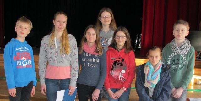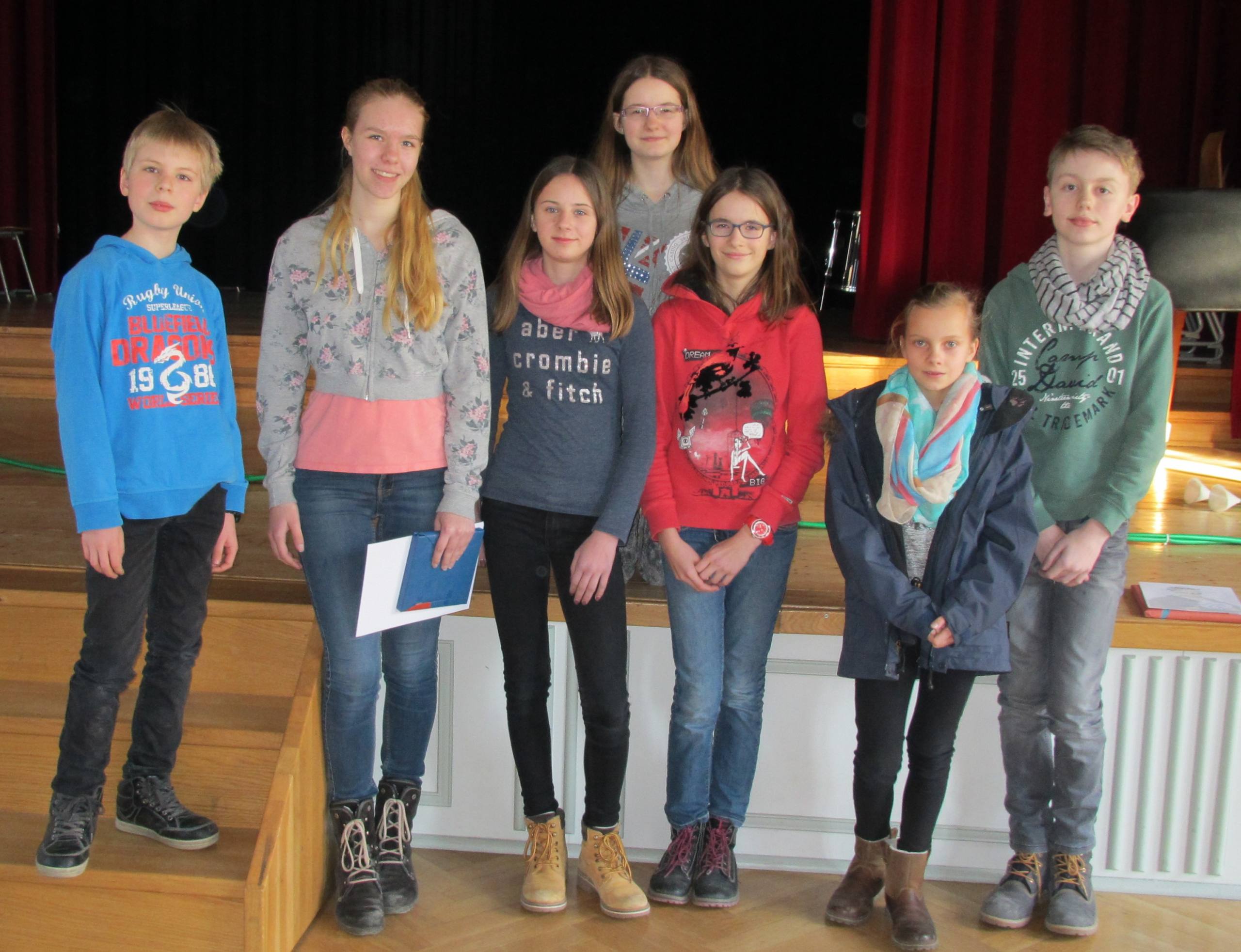 Erreichten auch tolle Plätze: Jakob Güldenberg (5e), Judith Wiegelmann (9b), Hannah Paulukuhn (7d), Anastasia Höpfner (6d), Greta Bahl (5e) und Lennart Götz (7d); dahinter: Leonie Wallusch (9b).