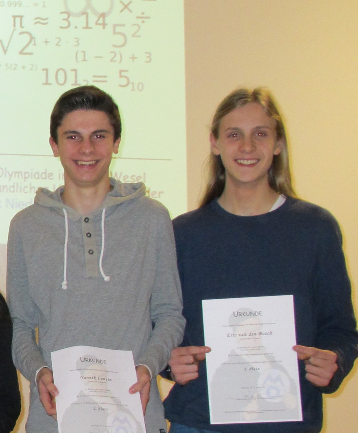 Und drei von ihnen, Lennart Götz aus der 7d, Yannick Cousin aus der Q1 und Eric van den Bosch aus der Q2 nehmen als Beste ihres Jahrgangs an der NRW-Runde, die am 25. Februar in Steinhagen stattfindet, teil.