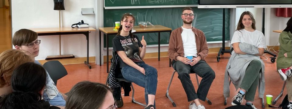 Neben der Beschäftigung mit der hebräischen Sprache und Literatur ist die Beschäftigung mit dem Judentum ein zentrales Anliegen des Hebräischunterrichts an unserer Schule. Oft haben die Schüler*innen nur ein recht abstraktes Bild von „den Juden“, doch durch authentische Begegnungen mit gleichaltrigen Jüdinnen*Juden wie unsere am 25. Mai gelingt es diese Vorstellung von „den Juden“ aufzubrechen und einen Einblick in die Vielfalt des authentischen jüdischen Lebens bei uns zu bekommen. Der persönliche Austausch bewirkt, was hundert Bücher nicht leisten können.