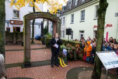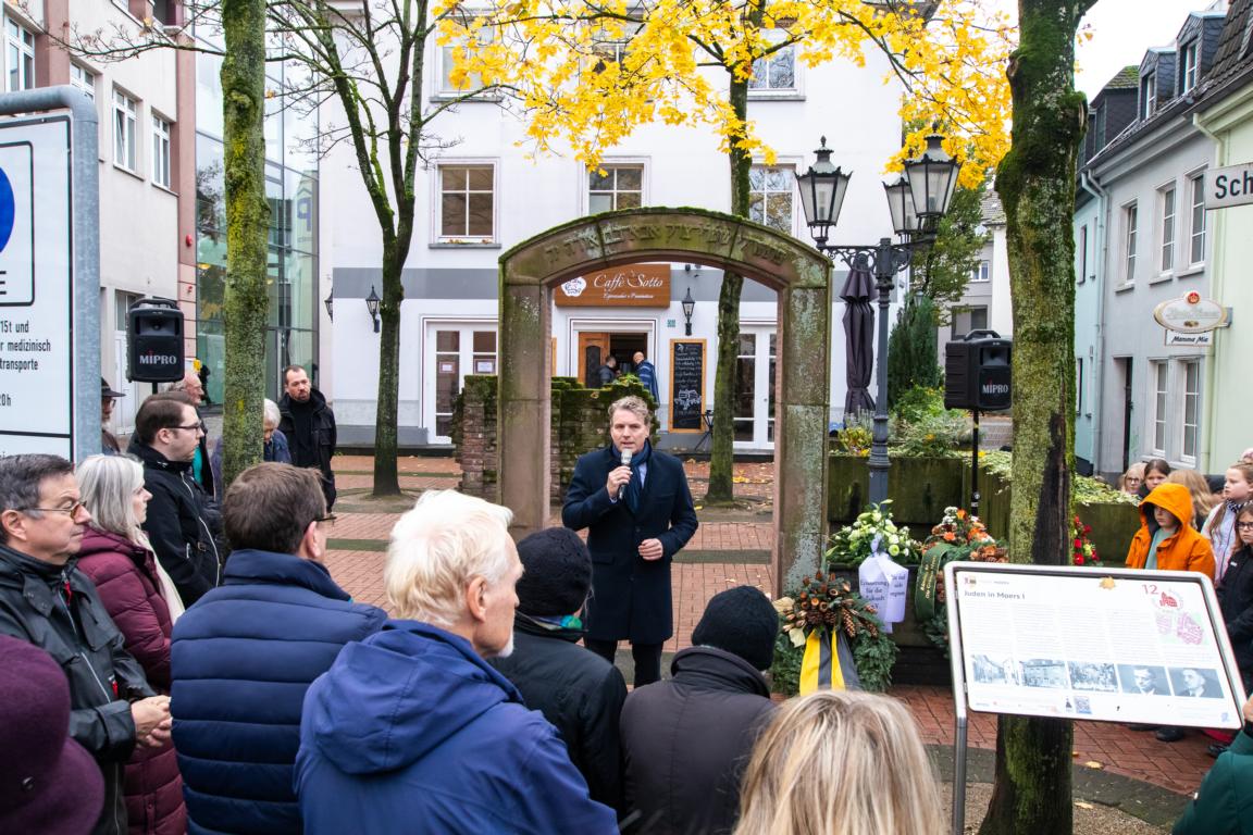 Um der Opfer zu gedenken, kamen am 09. November 2023 viele Menschen am Synagogenbogen zusammen. In einer Gedenkstunde der Gesellschaft für Christlich-Jüdische Zusammenarbeit (GCJZ), die um 11 Uhr begann, wurden die 190 Namen der Moerser Opfer von Schülerinnen und Schülern verlesen und es wurden Kränze niedergelegt.