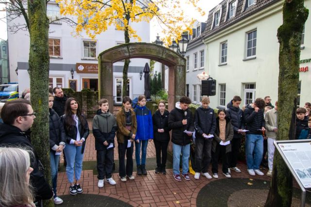 Am 09.11.2023 sind wir mit unserer Klasse und den beiden Lehrern Herrn Schirra und Frau Schindler in die Moerser Stadtmitte gegangen, um dort an einer Gedenkveranstaltung teilzunehmen.