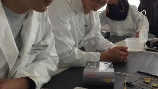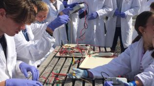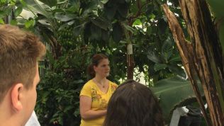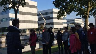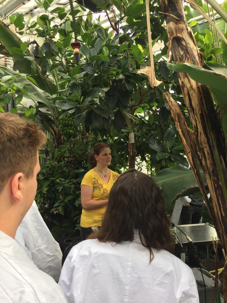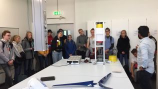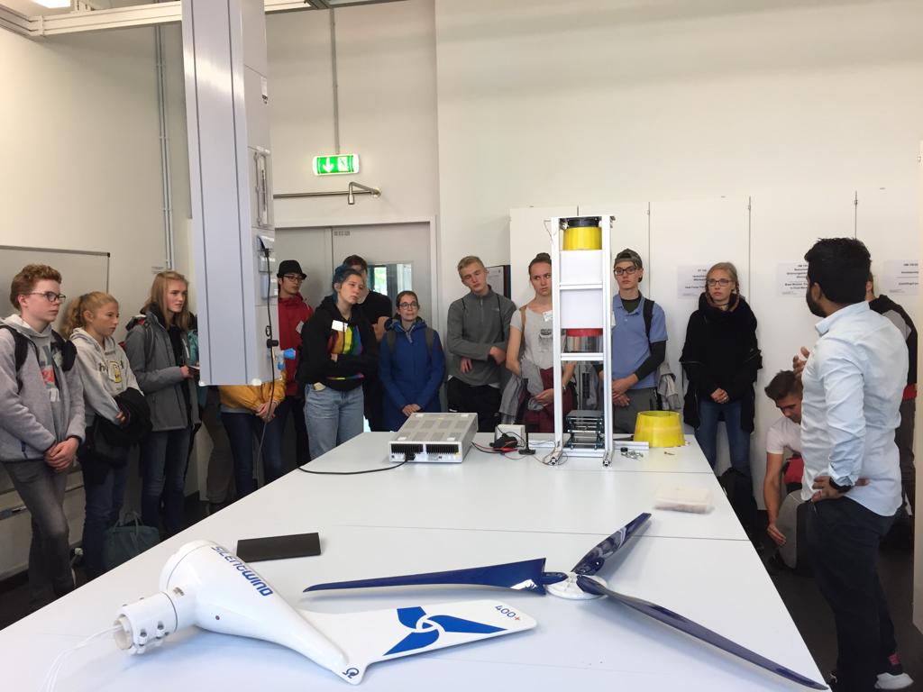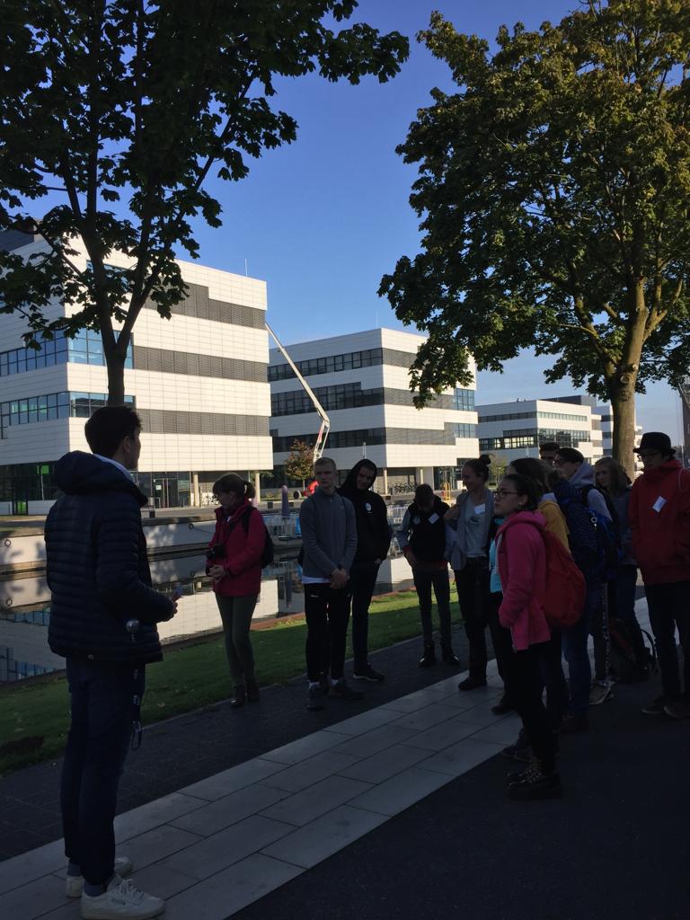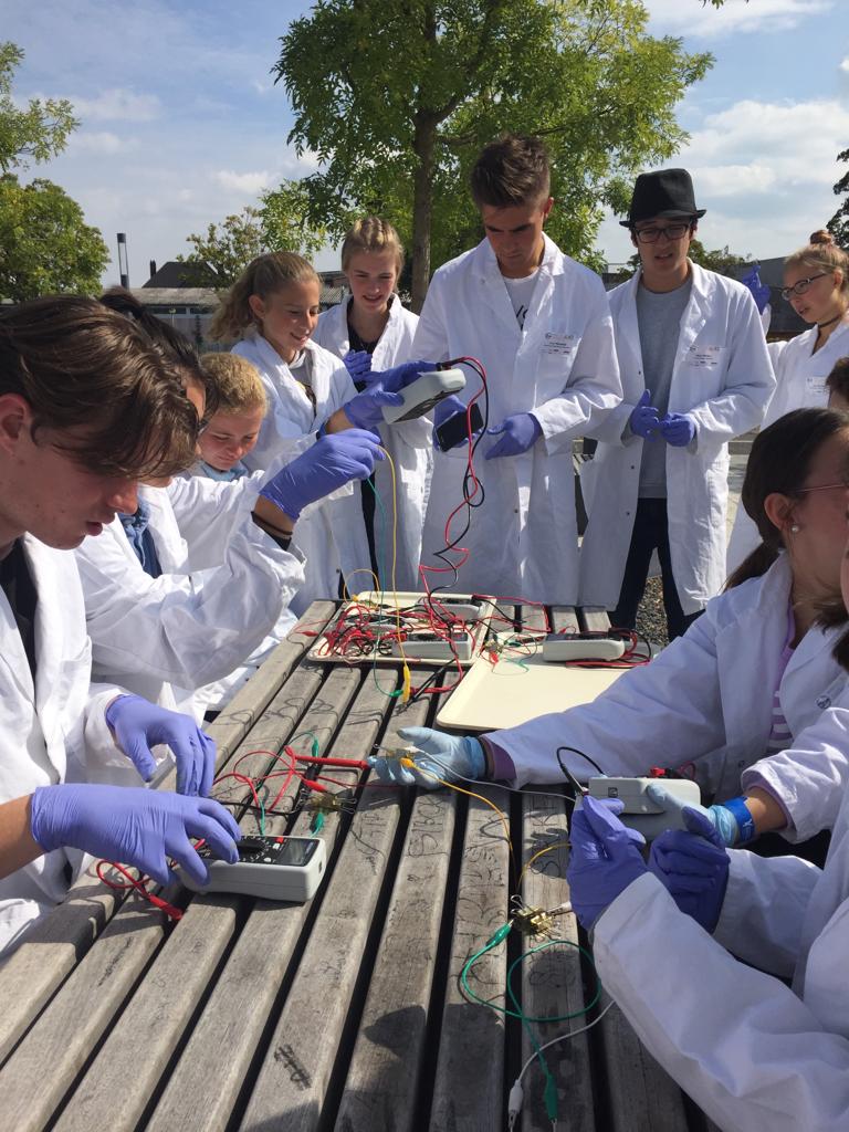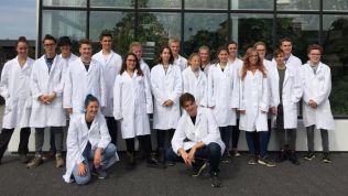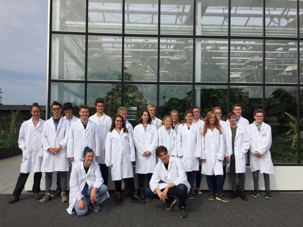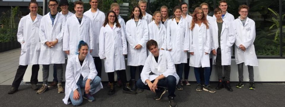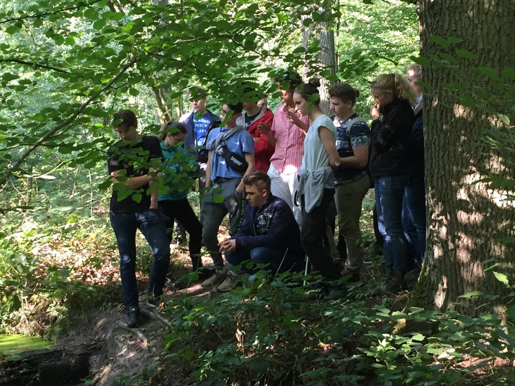 Am Dienstag, Camp-Tag Nr. 3, machte sich die Truppe auf zur Hochschule Rhein-Waal, Campus Kleve. Dort begrüßte Frau Bracht-Nienaber vom zdi-Zentrum „Clever-MINT“ die Teilnehmerinnen und Teilnehmer, die im Folgenden einen spannenden Tag zum Thema „Energie und Bionik" erleben sollten. Nach einer Campusführung und einem Vortrag zum Thema „Biometrische Rotorblätter an Windkraftanlagen" durch Ingenieur Sawkat Hossain folgten Experimente zum Bau einer Farbstoffsolarzelle (Grätzel-Zelle) im Schülerlabor der Hochschule. Auch der Besuch des tropischen Gewächshaus mit Lehr- und Schaugärten am Campus Kleve mit Messungen zur Fotosyntheseleistung von Pflanzen durfte nicht fehlen. Abgerundet wurde der Tag mit einer Exkursion in das Waldgebiet Leucht bei Alpen. Hier führten Rosemarie Kerstan sowie die Biologielehrerinnen Katharina Adams und Dr. Evelyn Kleine die MINTler durch das Biotop und unterstützen sie bei der Erkundung der Flora und Fauna im Rahmen einer spannenden Stationenarbeit.
