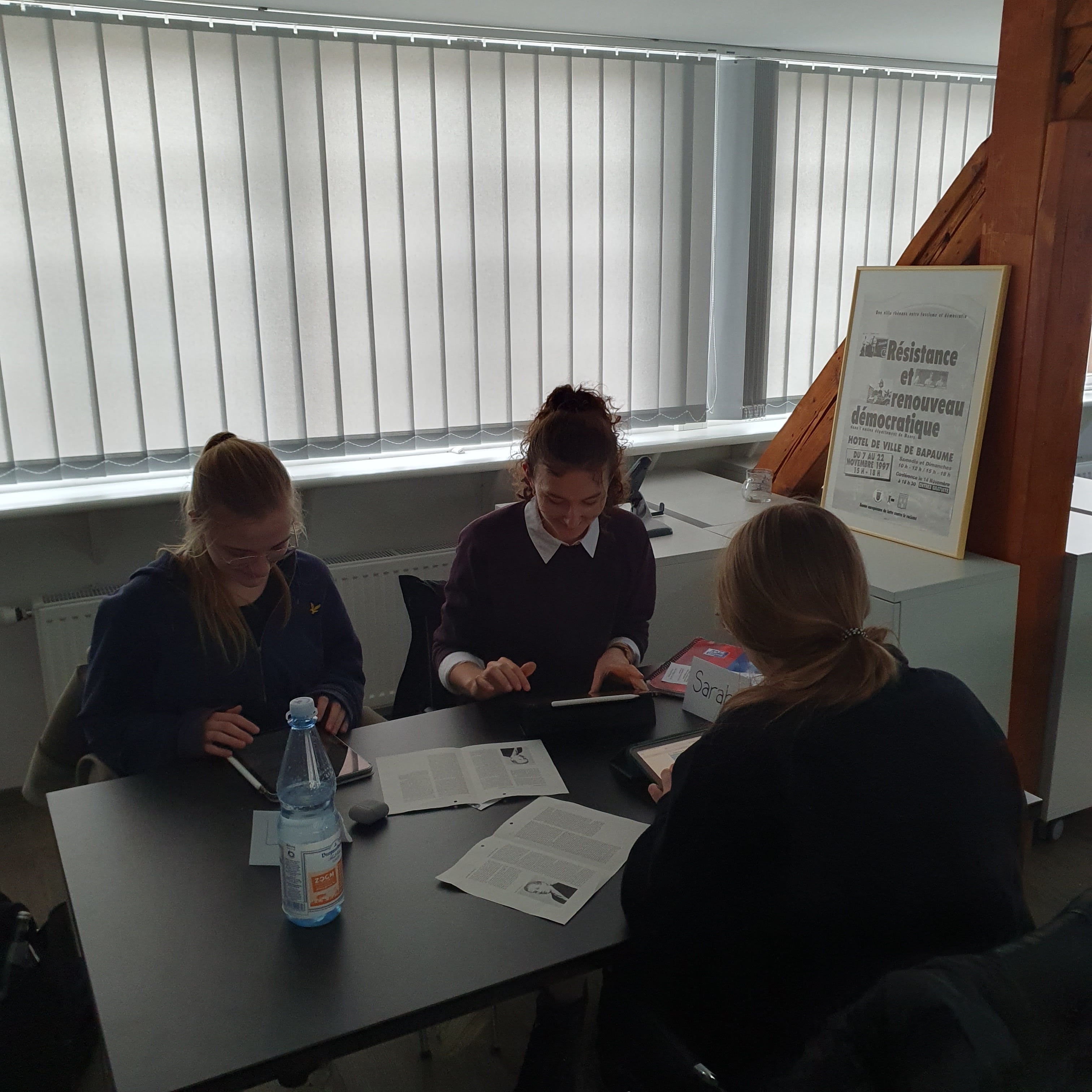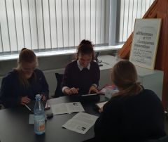 Laura Scholten, Sarah Hamid und Laura Vutz (Q2) bei der Auswertung der Materialien