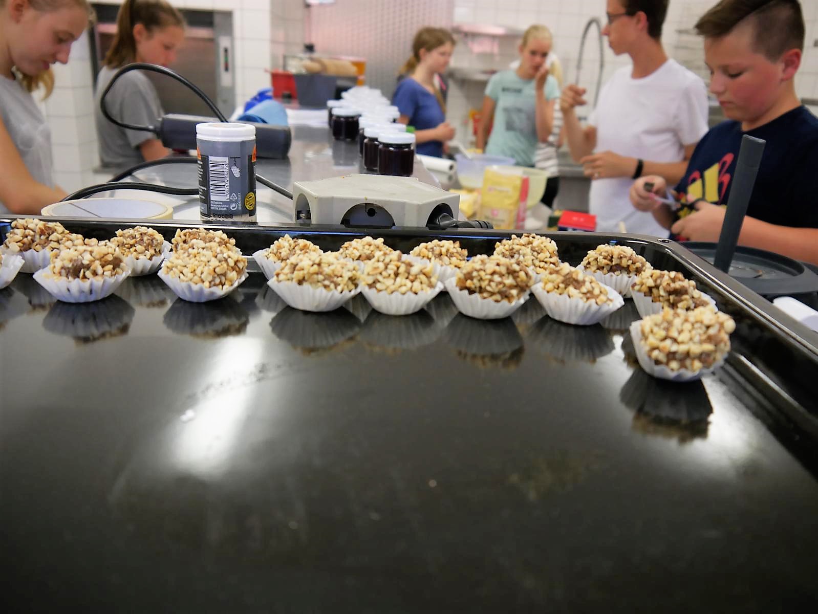 Auch im „Küchen Querbeet“ - Projekt geht die Arbeit weiter. Die hergestellten Speisen werden am morgigen Präsentationstag von der Gruppe verkauft. Muffins, Kuchen, Konfitüre und auch herzhafte Kleinigkeiten haben die Schülerinnen und Schüler in den letzten Tagen hergestellt. Heute standen Küchlein und Muffins aber auch Kartoffel- und Nudelsalate als Mittagessen auf dem Speiseplan. Besonders stolz sind die Teilnehmer und Teilnehmerinnen, wenn sie ihre eigenen Speisen später kaufen können und wissen, dass sie z.B. die Konfitüre selbst hergestellt haben.