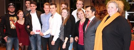Begabte Filmemacher: Vertreter der Q2 mit Miriam Milde, Regine Meyering und Giovanni Malaponti, Vorstandsvorsitzender der Sparkasse am Niederrhein.