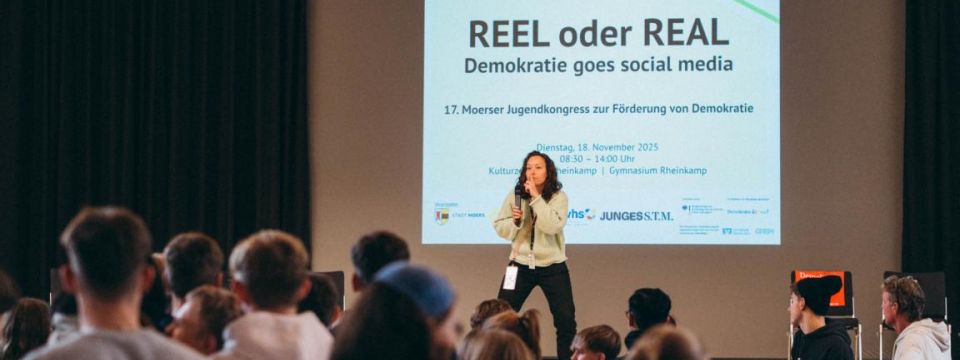 Auch in diesem Jahr nahmen Schülerinnen und Schüler unserer Schule am Moerser Jugendkongress teil. Unter dem diesjährigen Motto „Reel oder Real – Demokratie goes social media“ arbeiteten über 180 Jugendliche aus verschiedenen Moerser Schulen gemeinsam daran, wie demokratische Werte im digitalen Raum gelebt und geschützt werden können.
