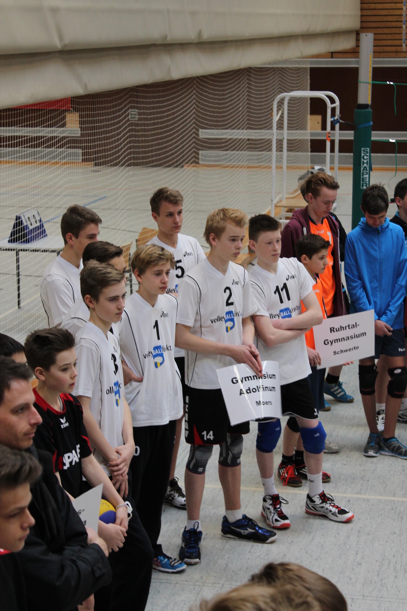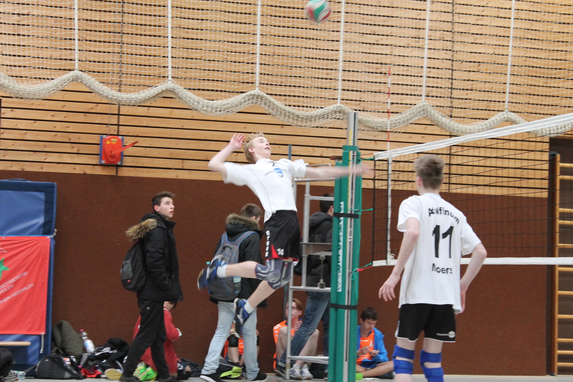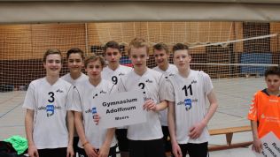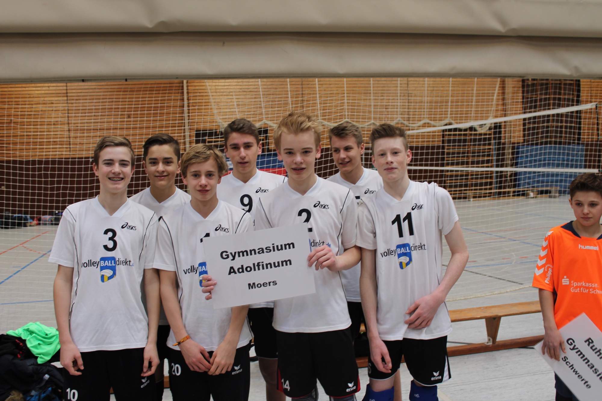Die Voraussetzung für den Coup schaffte das Team des Adolfinums bei den Bezirksmeisterschaften in Essen Ende Januar: nach langen Jahren mit vielen 2. Plätzen konnten die Moerser Jungs das Carl-Humann Gymnasium Essen endlich einmal auch in der Halle bezwingen. Mit 2:0 blieb man dank seiner Blockstärke – die im Übrigen auch im Landesfinale den Unterschied machte – die Oberhand und sicherte sich nach drei Jahren Wartezeit wieder die Qualifikation für das Landesfinale der besten sechs Schulmannschaften aus NRW in Marl. "Der Erfolg ist umso höher zu bewerten, als dass fast alle Jungen erst zwei Tage zuvor aus der Wintersportfahrt des Adolfinums zurückgekehrt waren und von der Piste direkt in die Halle gewechselt haben", so Trainer Schattenberg. Die Jungen der Wk II mussten sich dagegen demselben Gegner ebenso deutlich mit 0:2 geschlagen geben. In diesem Fall leider „same procedure as every year“.