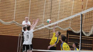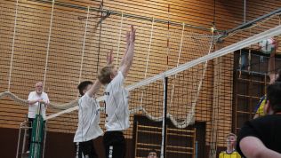 Und damit nicht genug: Satzball Paderborn bei 24:21. Doch hier zeigte sich die Klasse der Moerser Jungen. Satzball durch einen beherzten Angriffsschlag von Moritz Liebisch abgewehrt, zwei gute Aufschläge hinterher und man war wieder im Rennen. Beim 26:25 verwertete Veit Bils die sich bietende Angriffschance und sicherte seinem Team damit den ersten Satz. Es blieb mehr als spannend, vor allem deswegen, weil sich die Adolfiner weiterhin den Luxus von 10 Aufschlagfehlern leisteten, so dass es immer eng zuging. Aber wenigstens blieb der Moerser Angriff stabil: Alle vier Spieler punkteten ein ums andere Mal (Moritz Liebisch, Veit Bils, Magnus Arens und Clemens Spoo, der im 1. Satz für Jan Schliekmann eingewechselt wurde), so dass sich kein Team absetzen konnte. Mit diesem stabilen Sideout (Angriffe nach der eigenen Annahme) und zwei gelungenen Blocks am Satzende wurde der Finaleinzug mit 25:23 gefeiert.