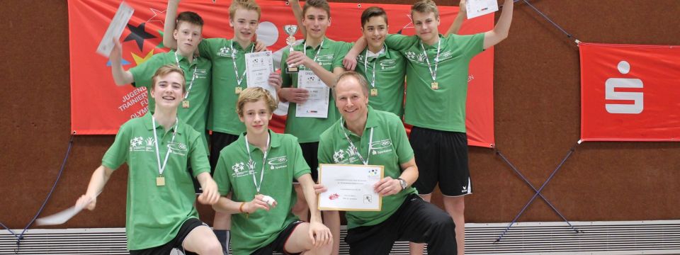 Großer Jubel am vergangenen Mittwoch (17. Februar 2016) in Marl: Die Jungen-Volleyballmannschaft des Adolfinums (Wettkampfklasse III) feierte dort den Einzug ins Bundesfinale in Berlin. „Ein echter Überraschungscoup“, freute sich der sichtliche stolze Trainer und Sportlehrer Martin Schattenberg. Denn im Finale besiegten die Adolfiner den großen Favoriten, das Marien-Gymnasium aus Bocholt. „Nach so vielen Jahren ‚Anlaufzeit’ haben wir es endlich auch einmal in der Halle geschafft, nach Berlin zu kommen. Die Jungs haben das fantastisch gemacht und sich für ihre viele Trainingsarbeit selbst belohnt“, so Schattenberg. In Berlin warten vom 26. bis 30. April 2016 die besten 15 Schulmannschaften aus ganz Deutschland auf den Landessieger NRW.