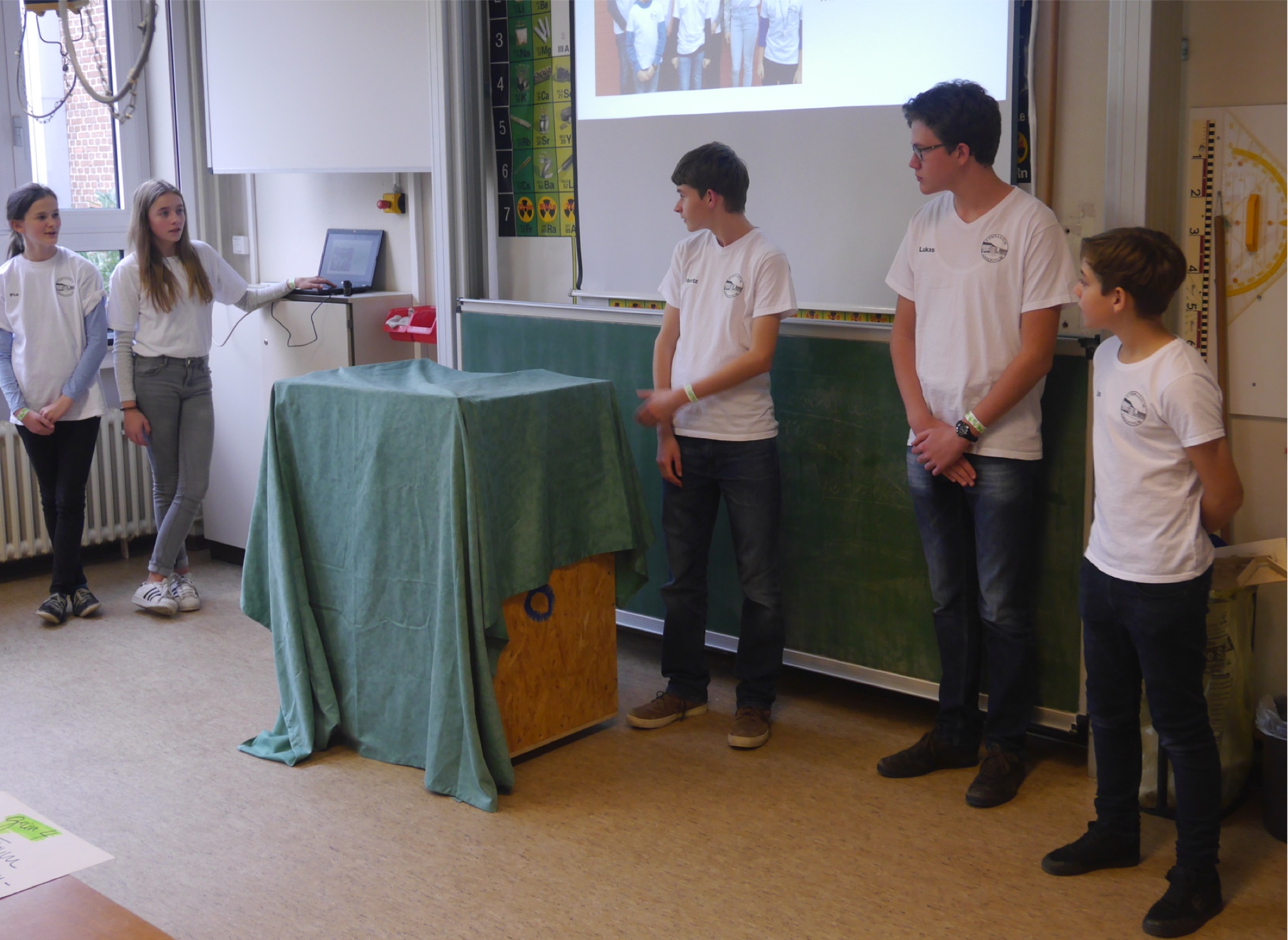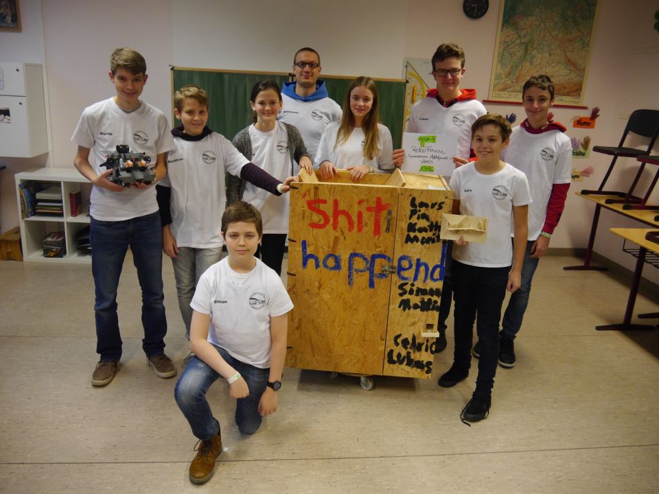 An ungezählten Nachmittagen hatte sich das Team im eigens eingerichteten Robotik-Keller der Schule auf die Aufgaben des Wettbewerbs vorbereitet. Der dabei gebaute und programmierte Roboter erledigte die Aufgaben auf dem Spielfeld des Robot-Games zuverlässig. Für die Forschungspräsentation hatte das Team ihr Projekt “The Shitter“ rechtzeitig fertig gestellt und erntete viel Lob bei der Generalprobe vor dem Physik+X-Kurs der Jahrgangsstufe 9 und bei der Vorstellung ihrer Idee vor einem Vertreter der ENNI. Das Team hatte einen Mülleimer für Hundekot entwickelt, der bei Einwurf eines Kotbeutels zur Belohnung von Hund und Besitzer einige Leckerli auswirft.