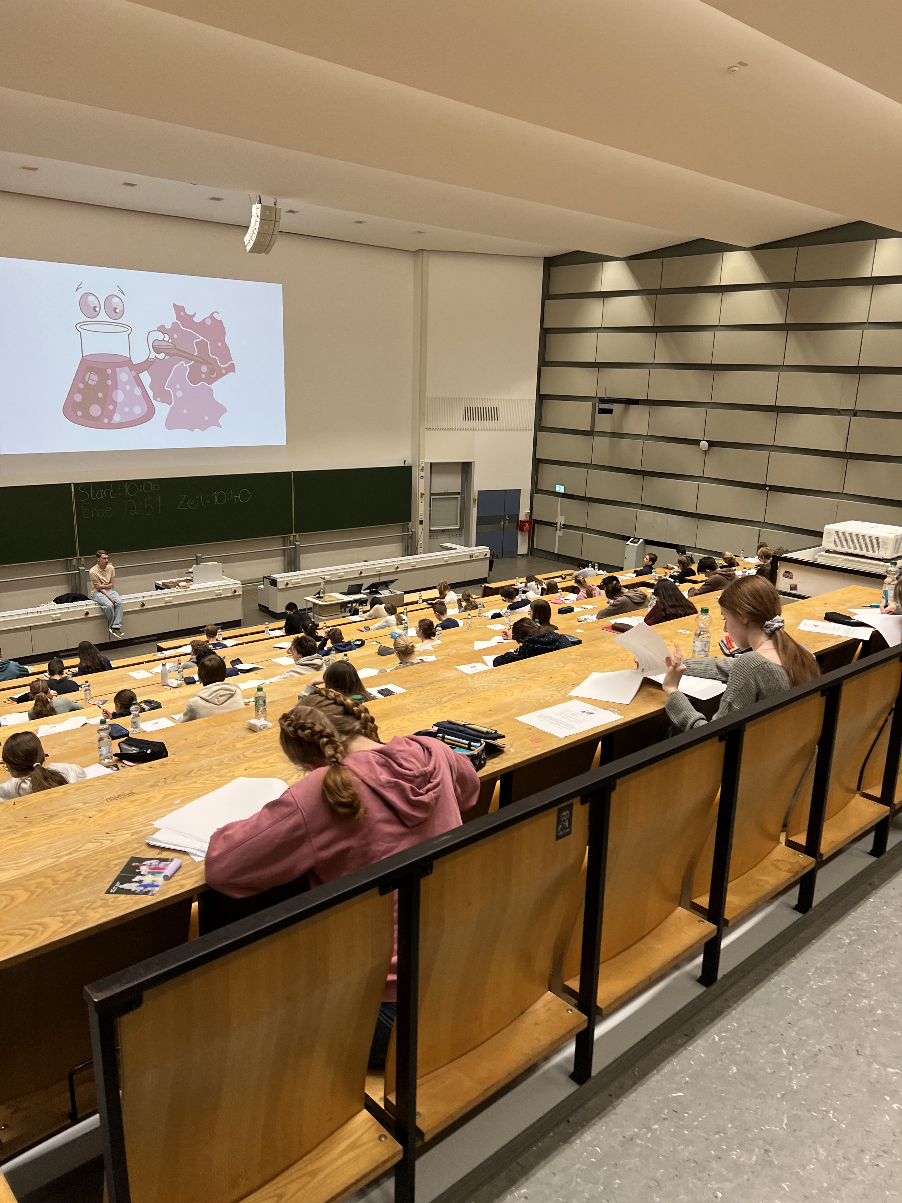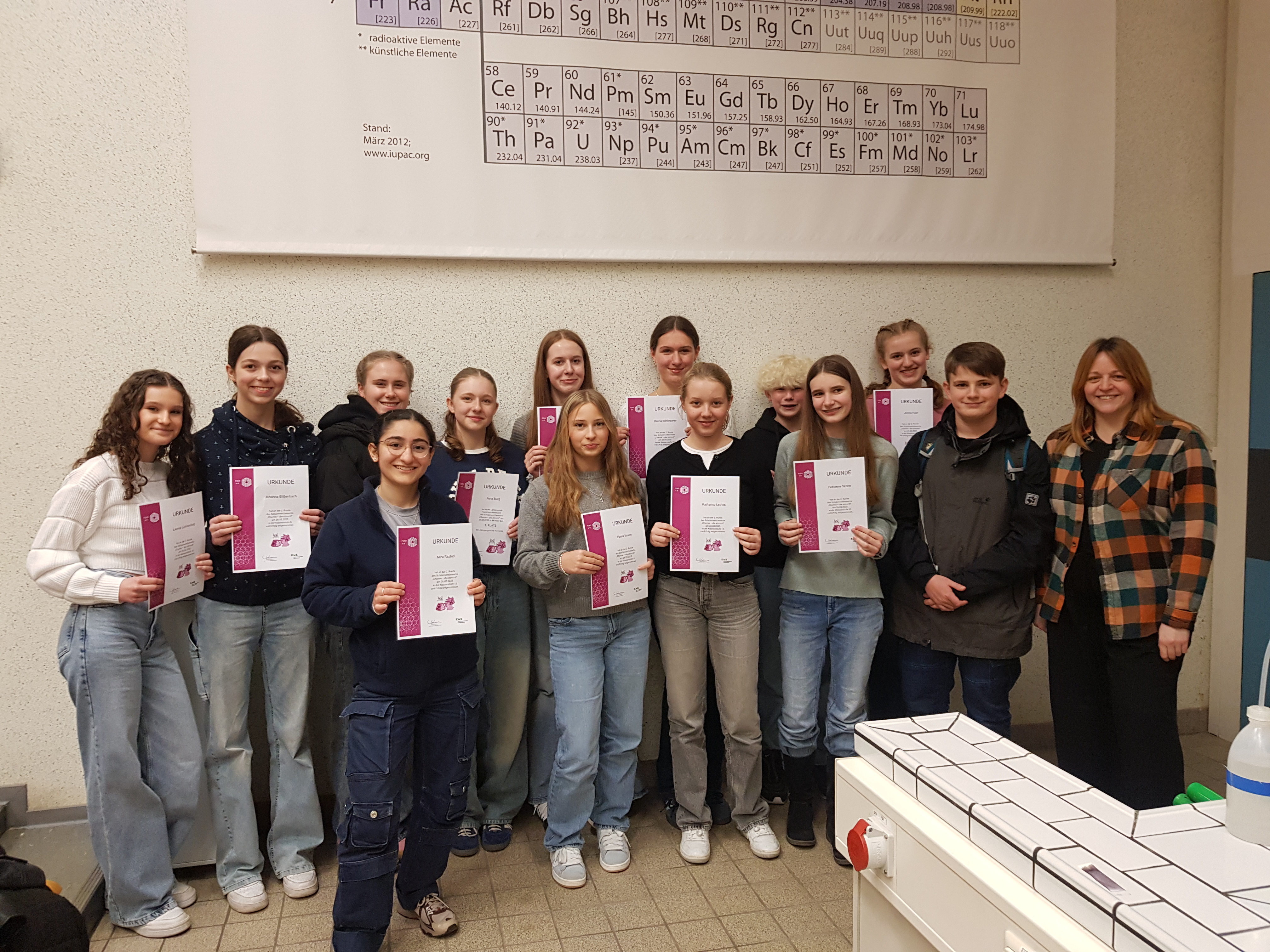 Am 26. März 2025 fand der vom Kultusministerkonferenz empfohlene Wettbewerb "Chemie - die stimmt" statt. Die besten 60 Schülerinnen und Schüler aus 485 Einsendungen aus ganz NRW wurden zur ersten Runde in die chemischen Institute der Universität Münster eingeladen. Unter den Qualifizierten war Runa Stieg (9b), die in einer dreistündigen Klausur mit ihrem beeindruckenden Chemiewissen überzeugte.