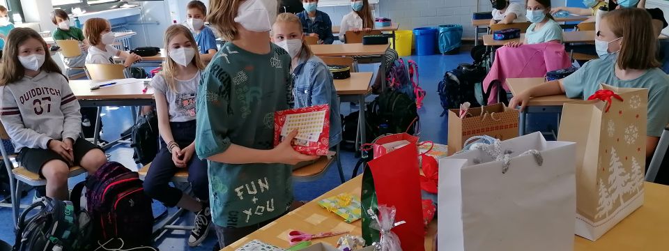 Zu den Klängen von „Schneeflöckchen, Weißröckchen“ betraten die überraschten Fünftklässler der 5c Anfang Juni ihren Klassenraum. Weihnachtsatmosphäre bei 30 Grad im Schatten? Des Rätsels Lösung bot der Tisch voller Geschenke: Das Weihnachtswichteln, welches dieses Jahr coronabedingt lange hatte verschoben werden müssen, konnte endlich stattfinden.