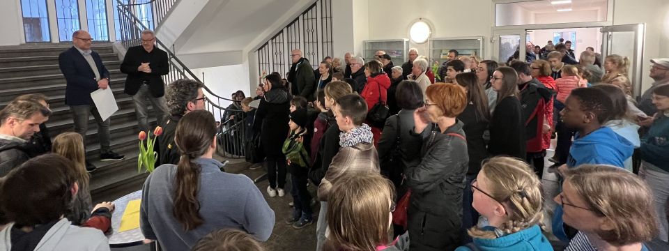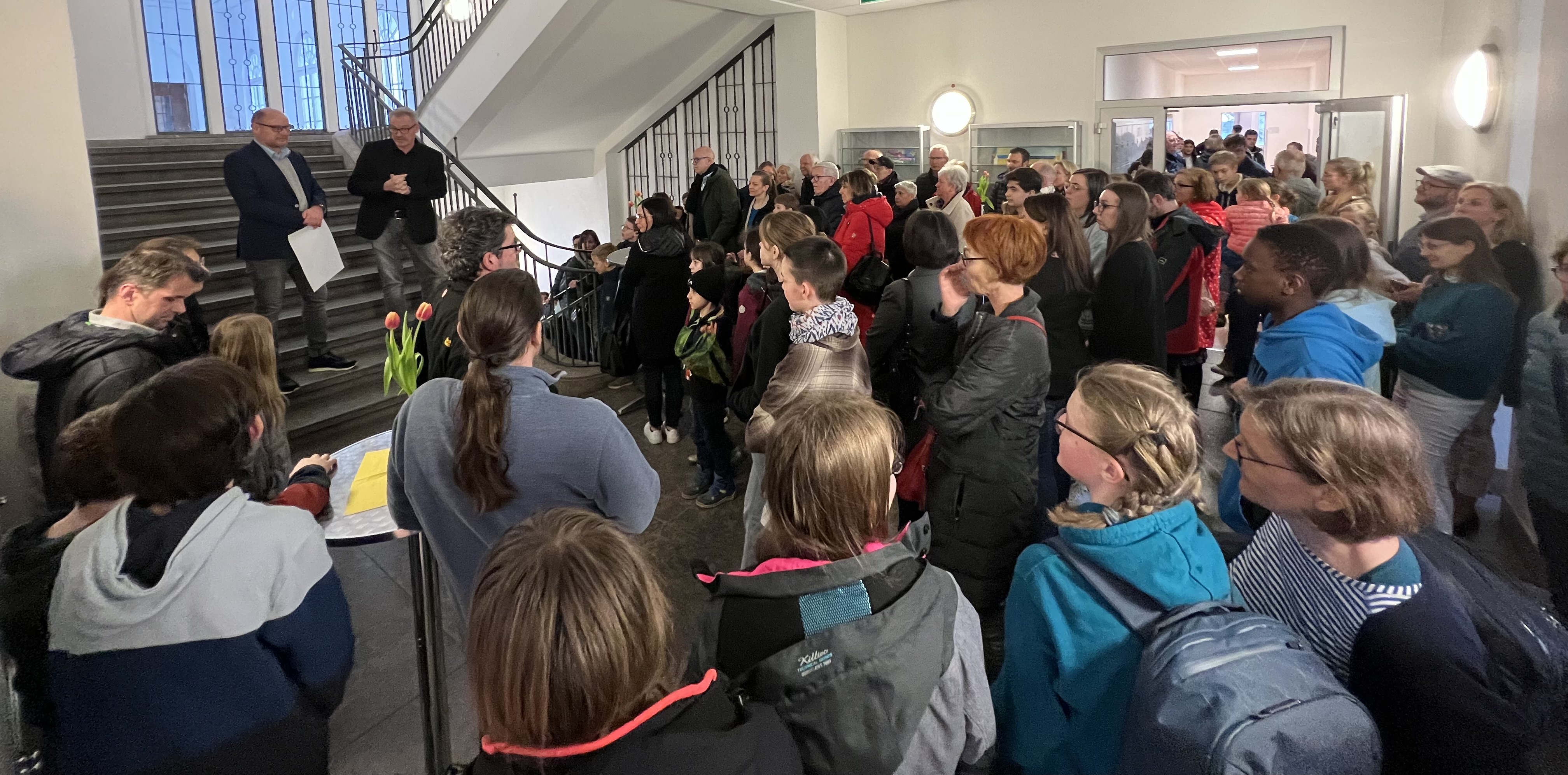 Besucherandrang im Altbau: Schulleiter Thorsten Klag und Lehrer Ernst Kisters begrüßten die Gäste zur Präsentation der Erweiterungsprojekte 2023.