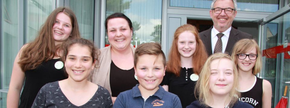 Die stolzen Redaktionsmitglieder: Laura König (8e), Sira-Liara van Dyck, Stella Buhl (beide 6d), Noemi Malaponti (8e), Leon Drüen und Hanna Radny (beide 6a) (v.l.n.r.) mit Schulleiter Hans van Stephoudt und Lehrerin Christina Ingenwerth.