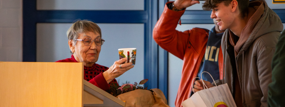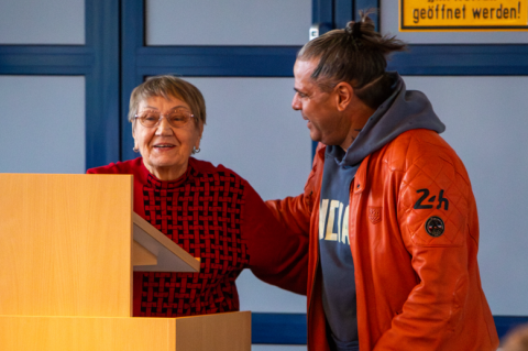 Luca Bell (Q2) überreicht der Zeitzeugin Andenken aus Moers