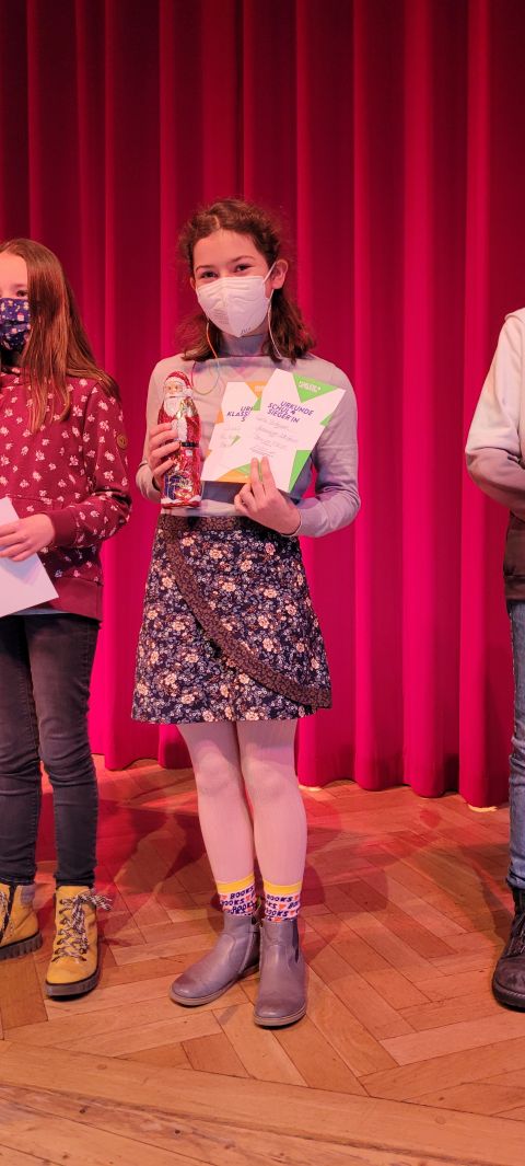 Deswegen bekamen auch alle gleichermaßen eine Anerkennungsurkunde und als zusätzliche Beigabe noch einen leckeren Schokoladen-Nikolaus verliehen. Am glücklichsten war jedoch verständlicherweise Carla Fortmann. „Ich hatte zwar gehofft, dass ich gewinne, war aber doch bis zum Schluss gespannt auf das Ergebnis", bekannte sie zum Schluss mit einem strahlenden Lächeln. Am liebsten, so erklärte sie, lese sie Harry-Potter-Bücher. Letztere habe sie allerdings schon alle durch. „Ansonsten mag ich aber auch andere Bücher. Vor allem Fantasy-Romane.“
