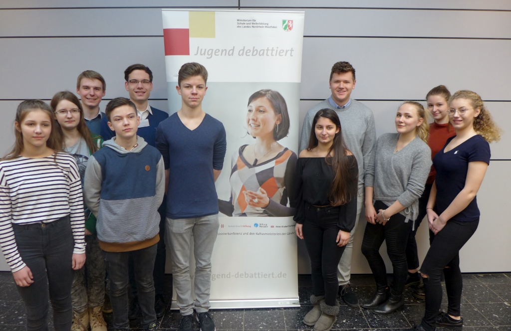 Aus der Sekundarstufe 1 traten Ben Schwarz und Julia Weber als Debattanten an, Leonie Wallusch und Lou Schulz fungierten als Nachrücker. Aus der Sekundarstufe 2 bestritten Lennard Mross und Anncharlott Henniges den Wettbewerb als Debattanten und ihre Nachrücker waren Sara Göhlich und Nora Kempkes. Julian Kramer und Timo Massold (beide Q2) wirkten als ehrenamtliche Schüler-Juroren mit.