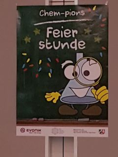 Die Feierstunde wurde von Herrn Kappe von der Firma Evonik eröffnet. Als Gastgeber stellte er die Firma Evonik vor und erzählte, wieso die Firma Evonik den Wettbewerb Chem-pions mit ausrichtet: Evonik möchte Schüler auf sich aufmerksam machen und chemieinteressierte Schüler schon frühzeitig kennenlernen. Vielleicht möchte ja später der ein oder andere Preisträger bei Evonik eine Ausbildung machen oder dort arbeiten. Es ist für Evonik also auch ein bisschen eine Werbeveranstaltung für sich als ausbildender Betrieb und als Arbeitgeber.