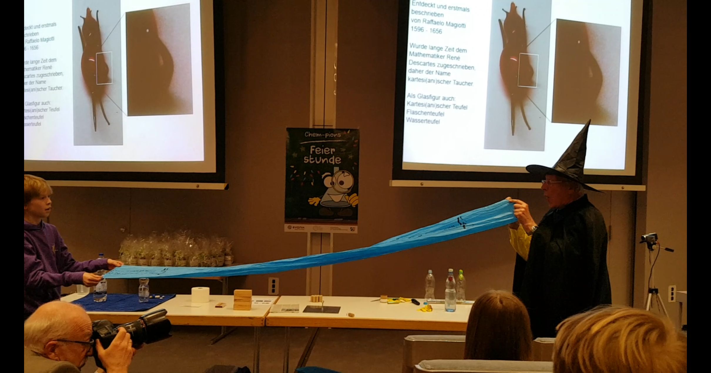 Besonders viel Spaß hat im weiteren Verlauf die Show „Wie verhext“ gemacht. Dort wurde neben vielen anderen spannenden Dingen gezeigt, wie man eine ungefähr 2 Meter lange Plastiktüte mit nur drei Luftzügen aufpusten kann oder wie man aus einer mit Wasser gefüllten Mineralwasserflasche ganz einfach einen Springbrunnen macht. Außerdem lernten wir, wie genau ein Luftballon platzt und wo man eine Nadel in den Ballon stecken kann, ohne dass der Ballon sofort kaputt geht.