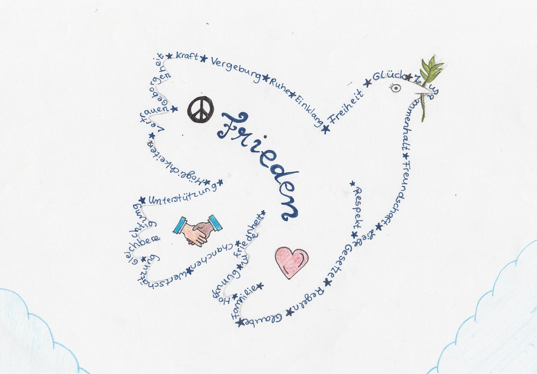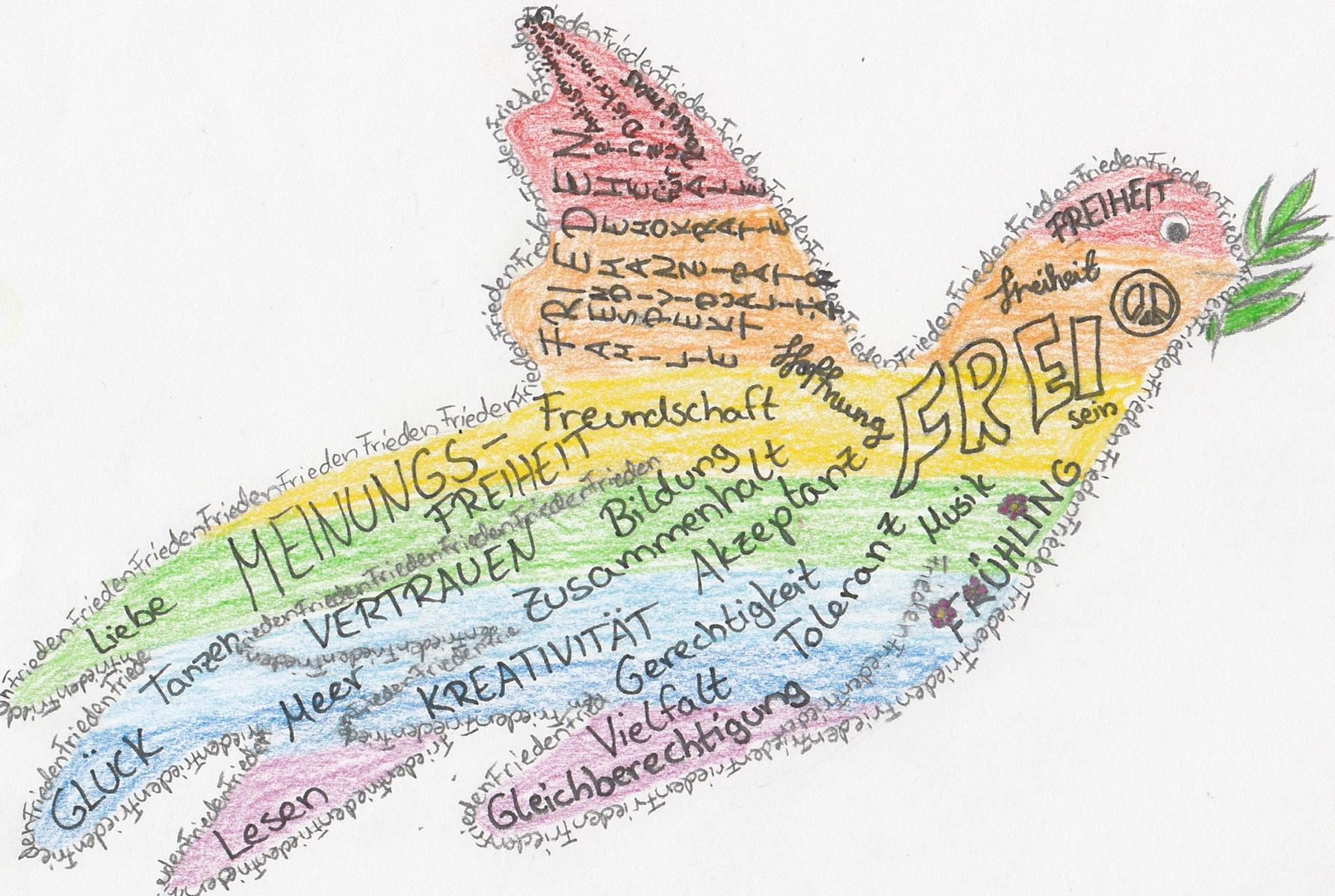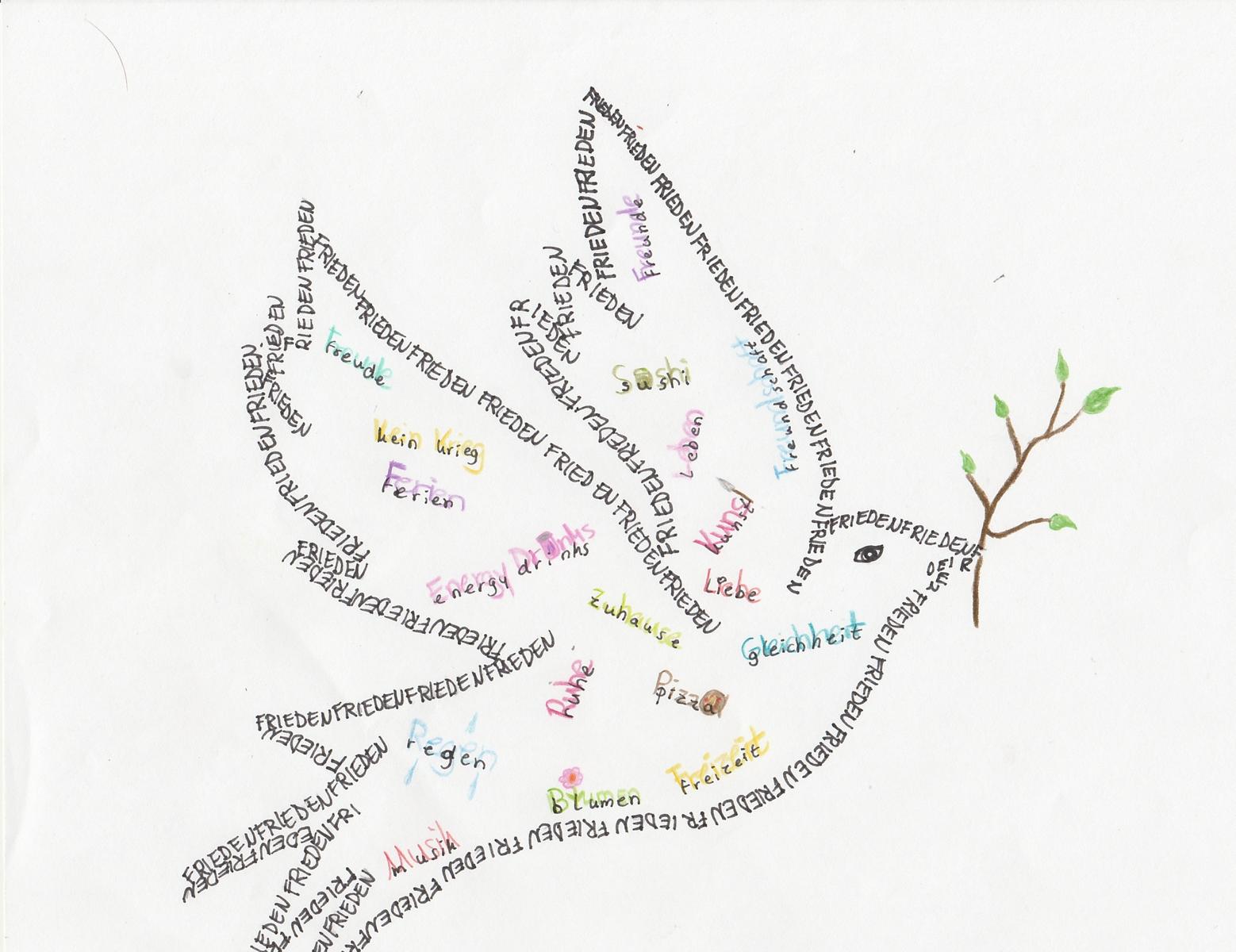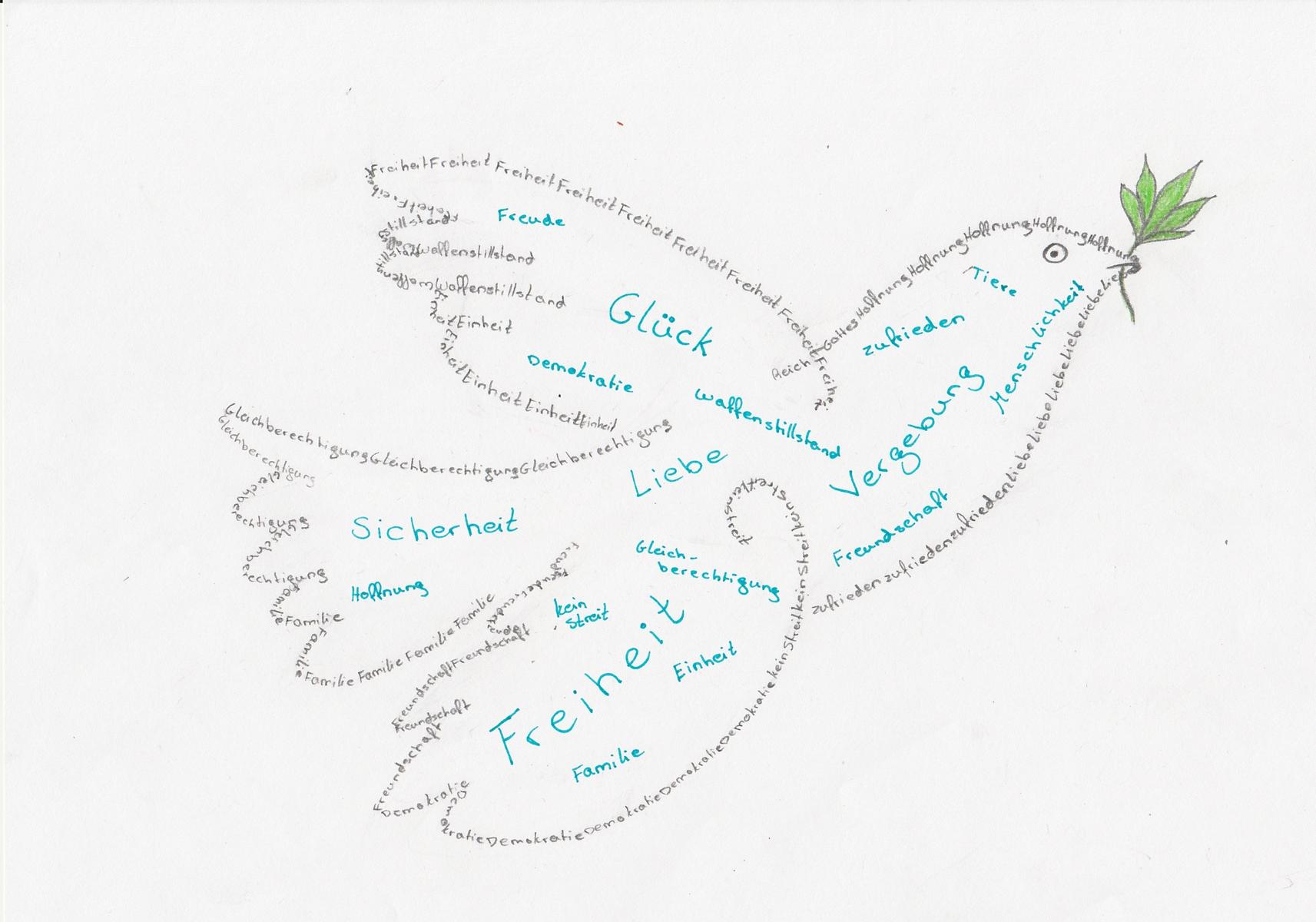 Schülerinnen und Schüler der Jahrgangsstufe 8 haben sich im Kunstunterricht Gedanken darüber gemacht, was Frieden ganz persönlich bedeutet. Neben Werten wie Freiheit, Liebe, Toleranz, Akzeptanz und Gleichberechtigung finden sich auch konkrete Bedürfnisse und Dinge wie Zuhause, Schlaf, Pizza und Musik, was zeigt, dass Nahrung, Schutz und Geborgenheit eben Grundbedürfnisse des Menschen sind.
