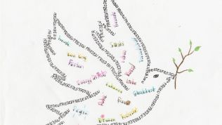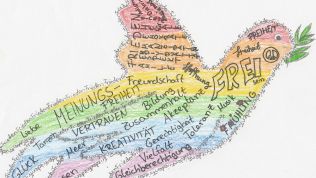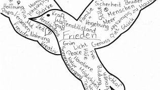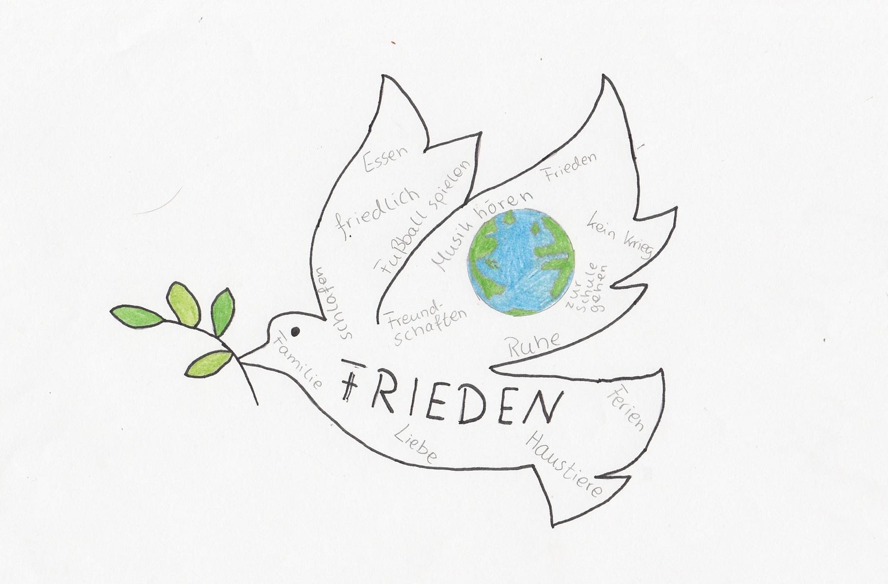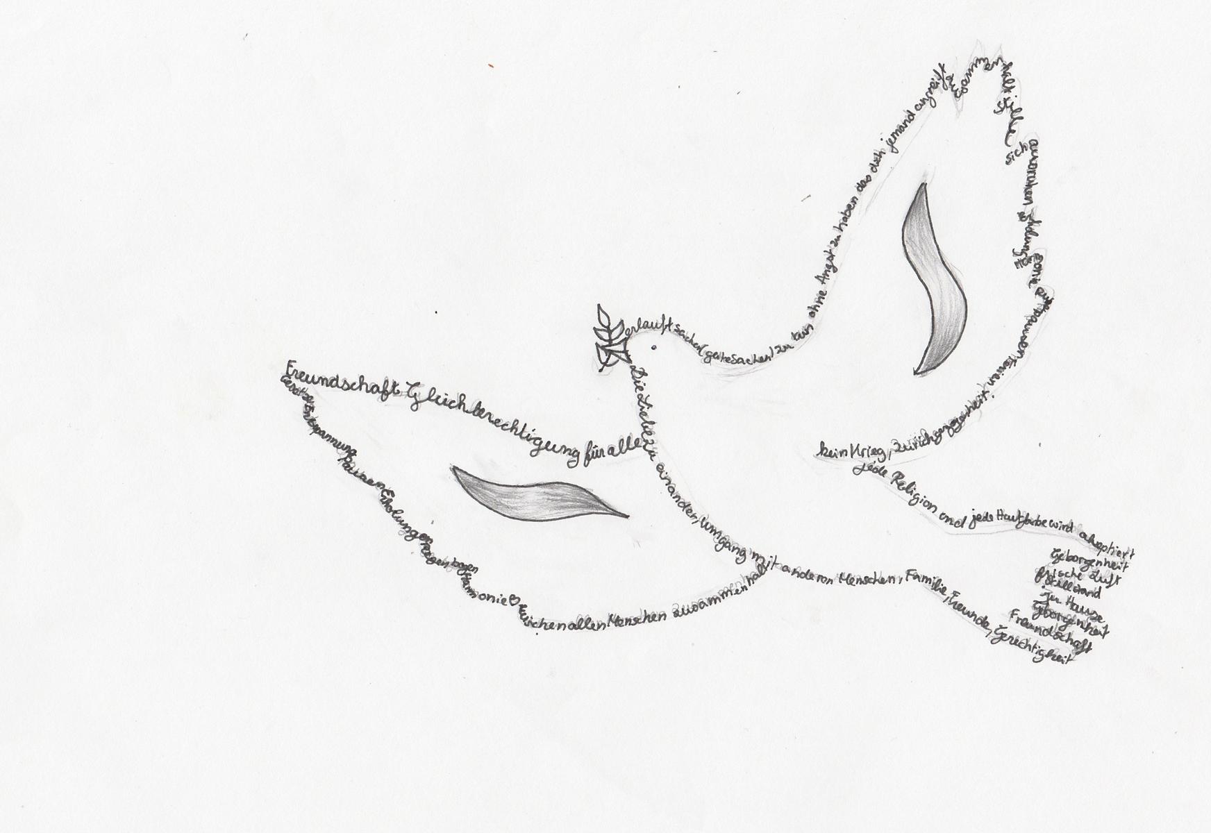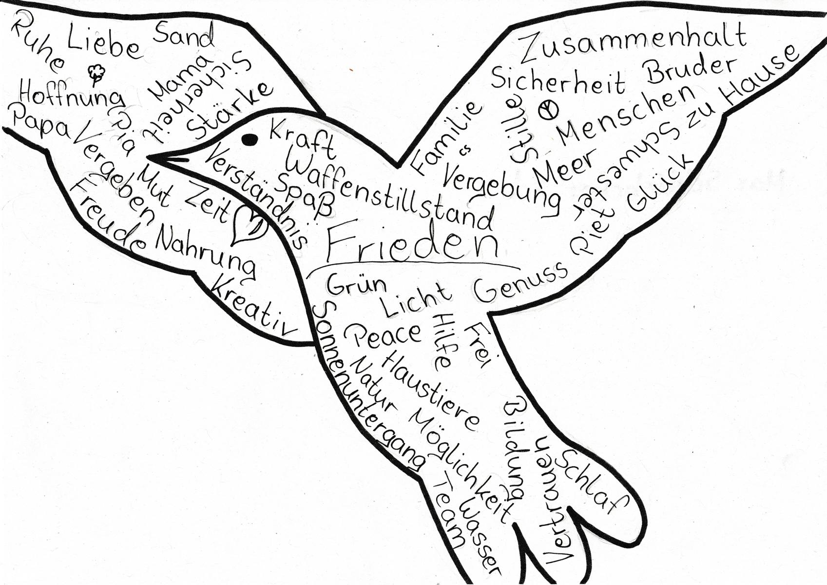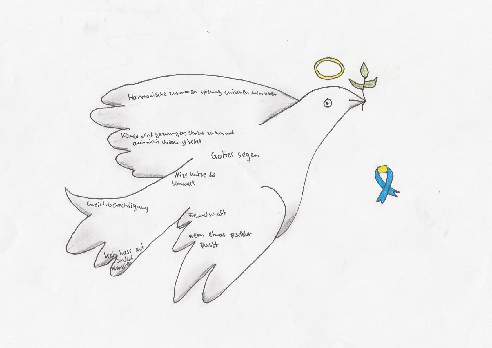 Schülerinnen und Schüler der Jahrgangsstufe 8 haben sich im Kunstunterricht Gedanken darüber gemacht, was Frieden ganz persönlich bedeutet. Neben Werten wie Freiheit, Liebe, Toleranz, Akzeptanz und Gleichberechtigung finden sich auch konkrete Bedürfnisse und Dinge wie Zuhause, Schlaf, Pizza und Musik, was zeigt, dass Nahrung, Schutz und Geborgenheit eben Grundbedürfnisse des Menschen sind.